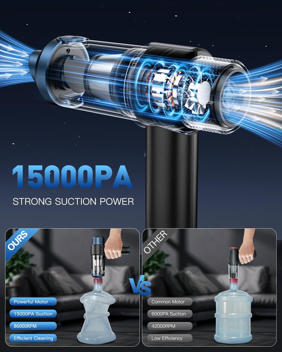 • 🌀【Powerful 15000PA Suction】Powerful motor of the hand held vacuum cleaner has 86,000RPM and provides up to 15000PA of suction power. Whether it's a sofa or carpet in your home, or the interior of your car, it's easy to clean. The rapid heat dissipation function can expel heat in a short period, making the motor more durable and long-lasting. The operating sound is as low as 40dB, so you can clean quietly without disturbing others