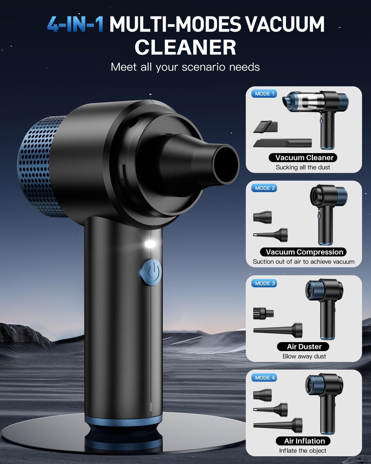 • 💠【4-IN-1 Car Vacuum Cleaner】Handheld Vacuum cleaner used with 7 accessories can be used to get 4 modes of suction, blowing, inflation and vacuum compression to meet your different use scenarios. Floor brush and nozzle brush can easily suck up all kinds of debris. Blowing nozzle can be used to blow away dust from keyboards and narrow crevices. Two sizes of universal nozzles can quickly inflate or expel air from objects such as swimming rings, mattresses, etc