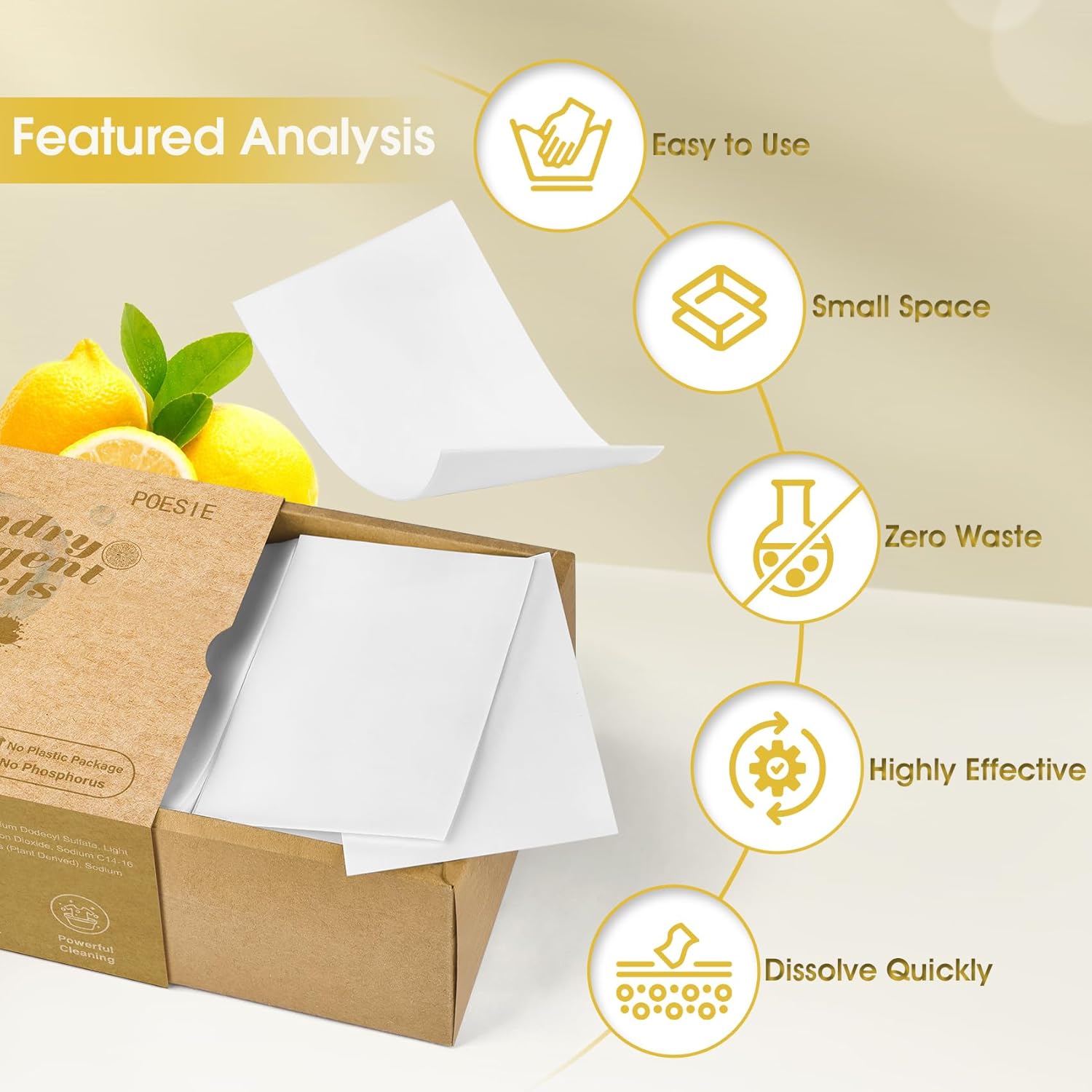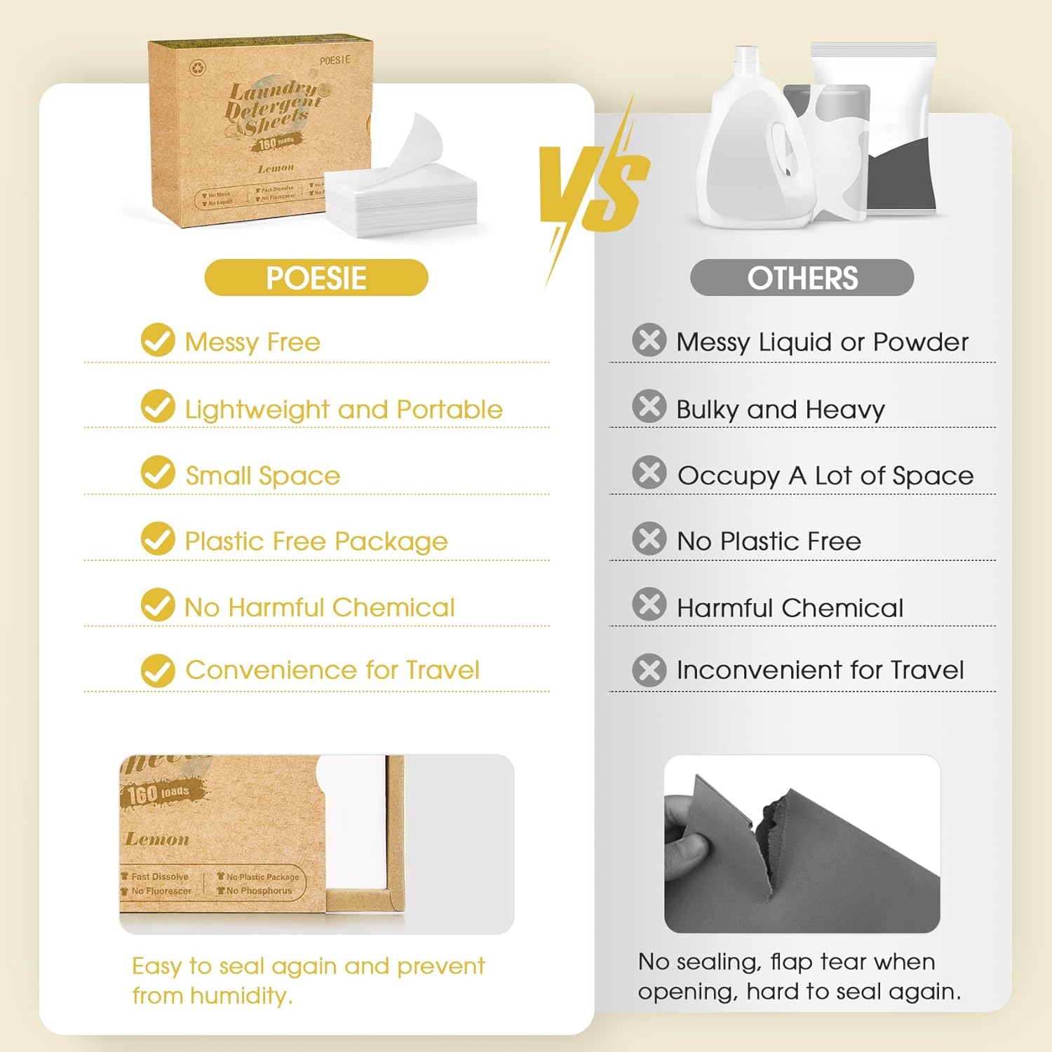 Poesie Laundry Detergent Sheet Lemon Scent 160 Count Non Plastic Travel Laundry Kit No waste Portable Washing Sheets Detergent for Machine Wash & Hand Wash