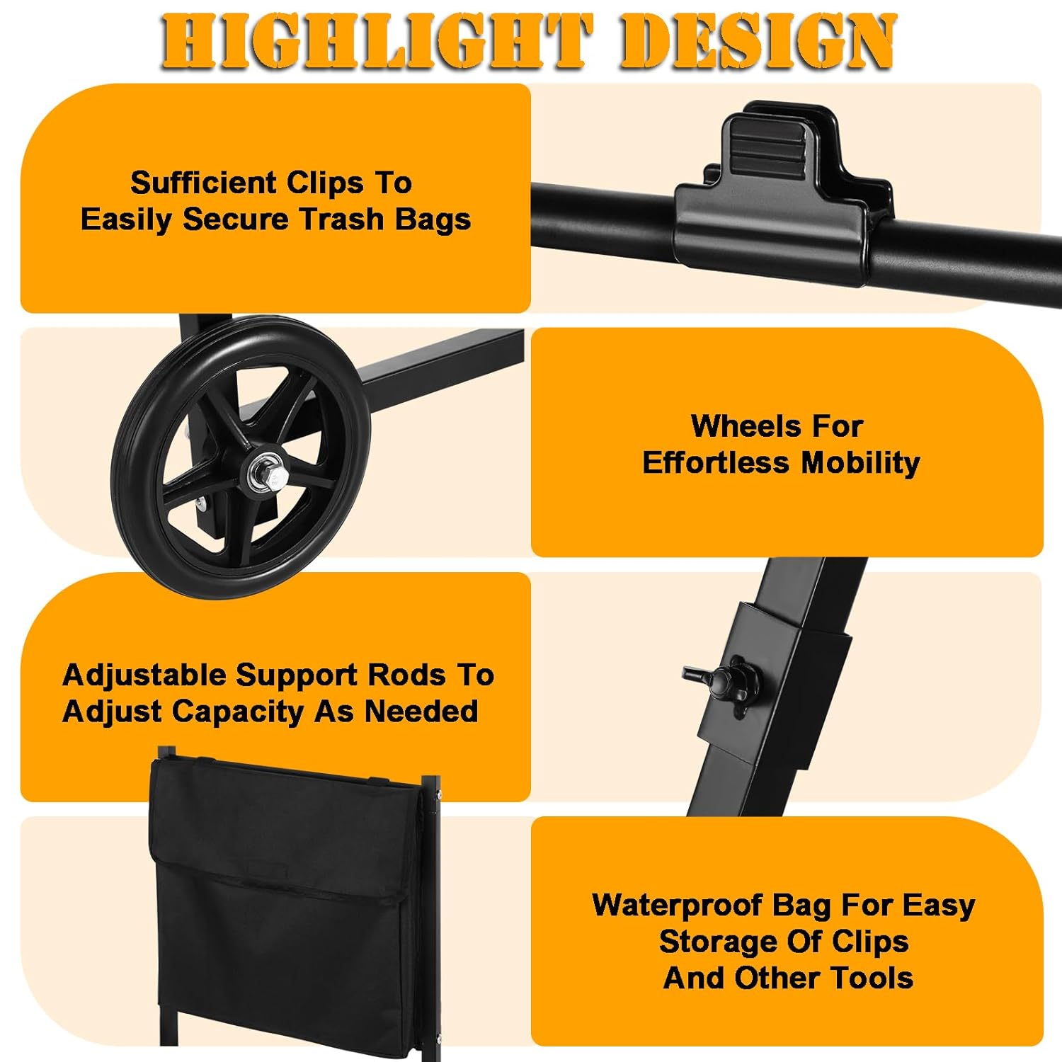 • Mobile Trash Bag Holder with Wheel Design: This leaf bag holder is made of heavy-duty steel frame, with powder coating that is sturdy and durable, resistant to wind and rain. The convenient design of the rear wheels can save you effort and improve your efficiency in handling garbage, while the two brackets can provide excellent stability.