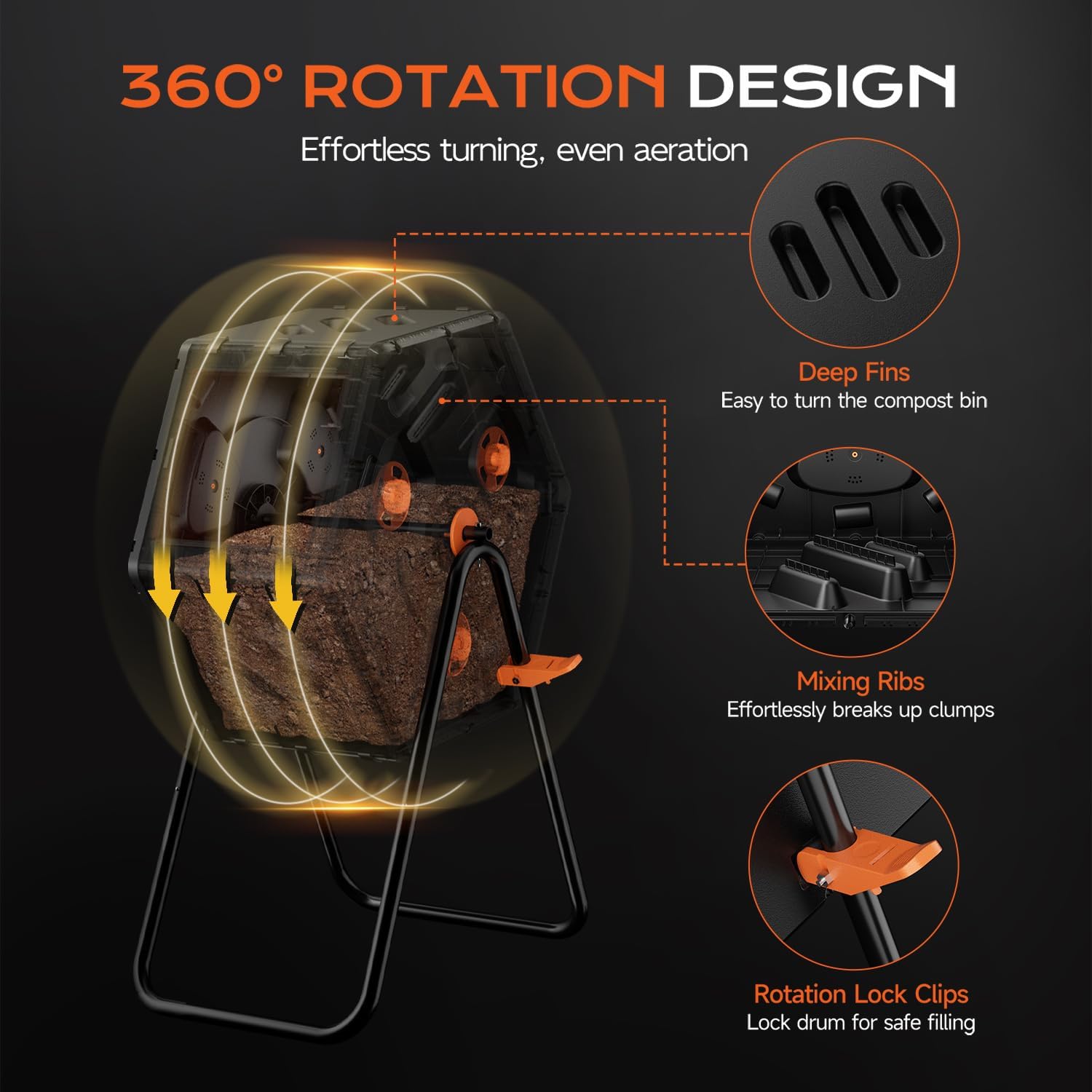 • 【Effortless 360° Tumbling】Simply rotate the outdoor compost bin 360° using the deep-grip grooves. Built-in mixing ribs break up clumps and aerate materials thoroughly – no manual turning required. Side-mounted rotation lock clips securely hold the drum for safe filling and unloading