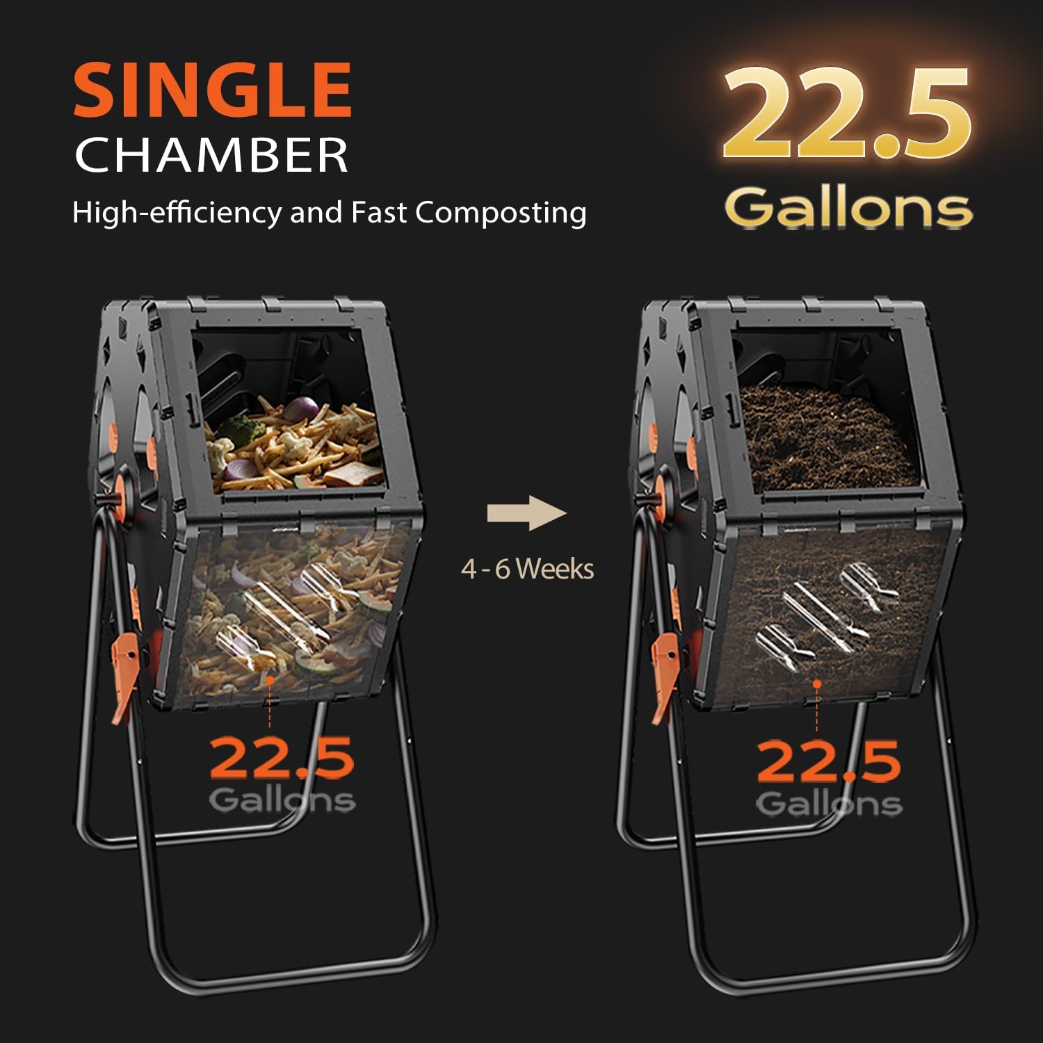 • 【Space-Smart Compost Tumbler】 The ideal 22.5-gallon size efficiently handles household kitchen and garden waste, making it the perfect space-saving solution for smaller yards or patios. Get started composting without sacrificing valuable outdoor space