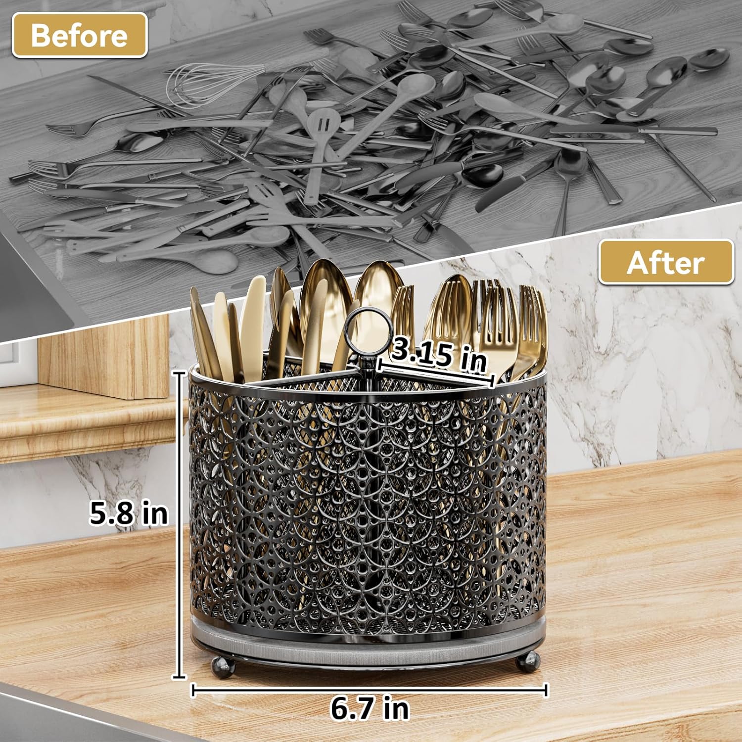 • 360°Rotating Silverware Organizer: This kitchen counter organizer offers a rotating design that makes your utensils easy to access .The rotation is smooth and effortless, adding a touch of modern functionality to your kitchen. Space-saving holder can perfectly organize your knife, forks, spoons etc. No more digging through the drawers or laying messy on the table. Just a simple spin to get what you need. Perfect utensils container for RVs, small kitchen