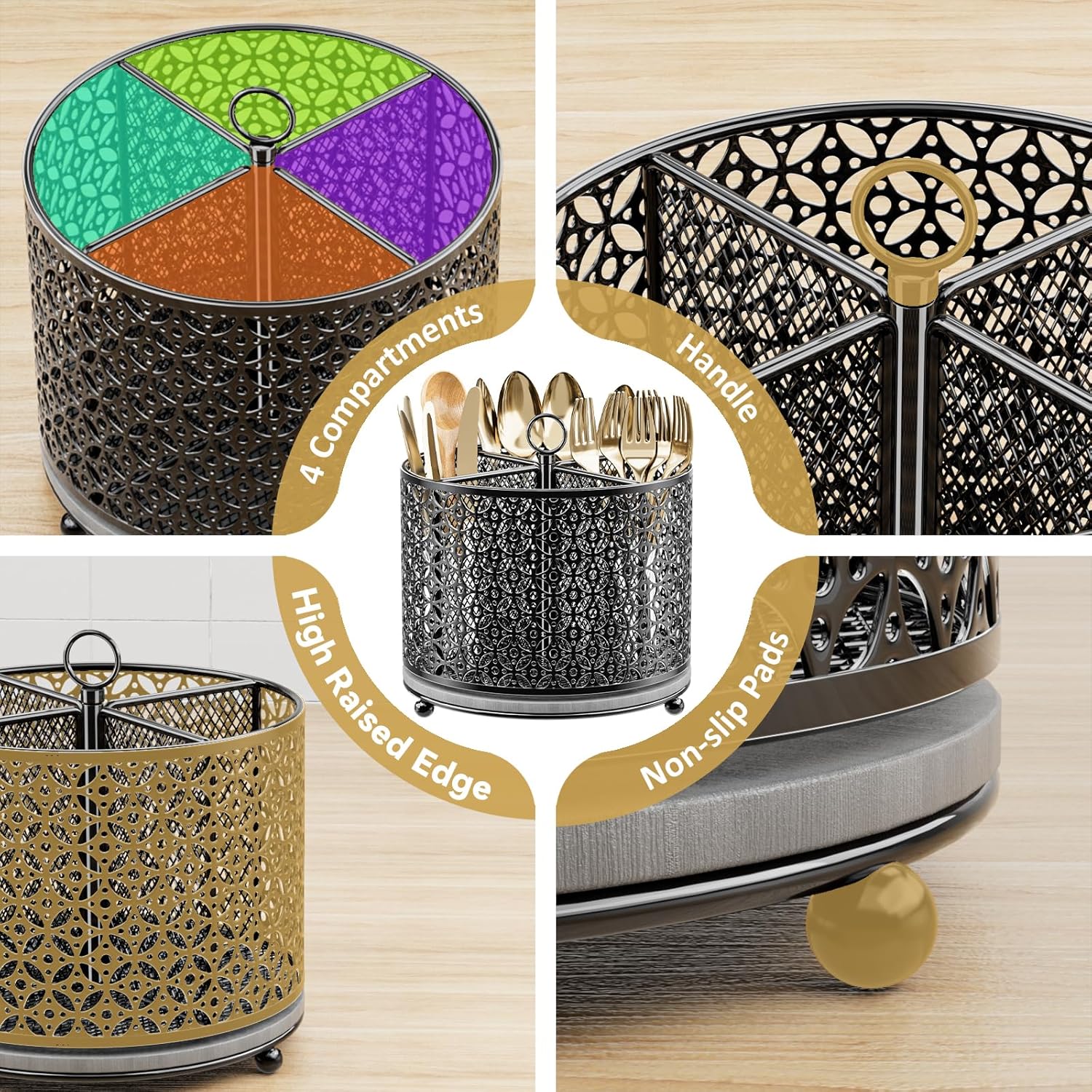 360° Rotating Utensil Holder Caddy - Fast-Drying Silverware Flatware Organizer - 4 Compartment Large Cutlery Holder with Handle For Kitchen Countertop Party Office Picnic Table Black
