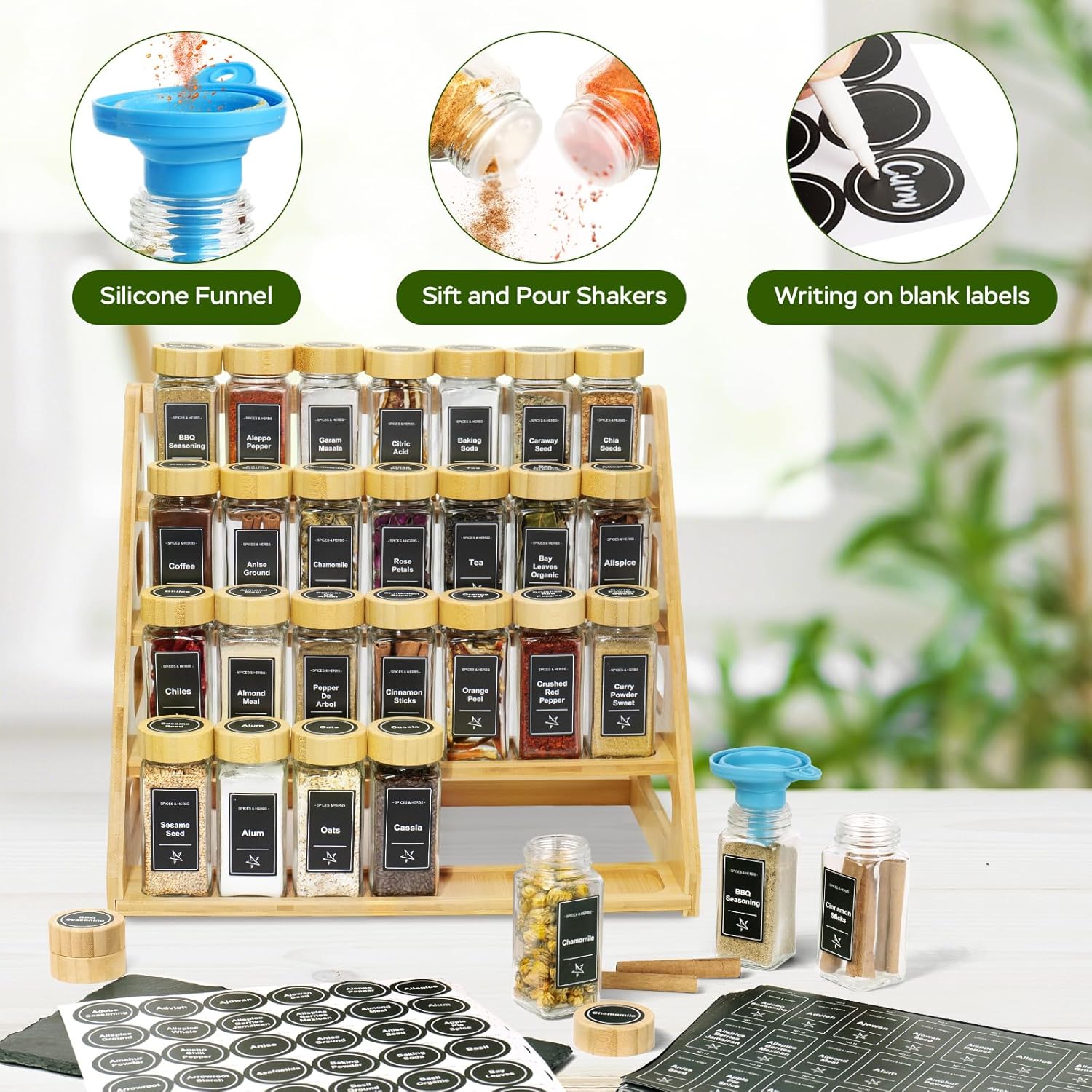 • 【A Complete Spice Organizer Tools Set】Hesitant about choosing a metal organizer or a bamboo organizer? After prolonged use, hollowed out metal shelves can become stained with grease and are difficult to wipe clean. Bamboo shelves are more beautiful, with a smooth surface that is easier to clean.1 x 4-tier Spice Rack, 28 x Square Empty Glass Spice Jars, 28 x Shaker Lids,1 x Collapsible Silicone Funnel, 1 x Chalk Marker, 780 Spice Labels(340 preprinted labels + 56 blank labels+340 preprinted labels+44 blank labels). The new updated spice rack organizer is designed specifically to turn any mess of spice into an organized masterpiece.