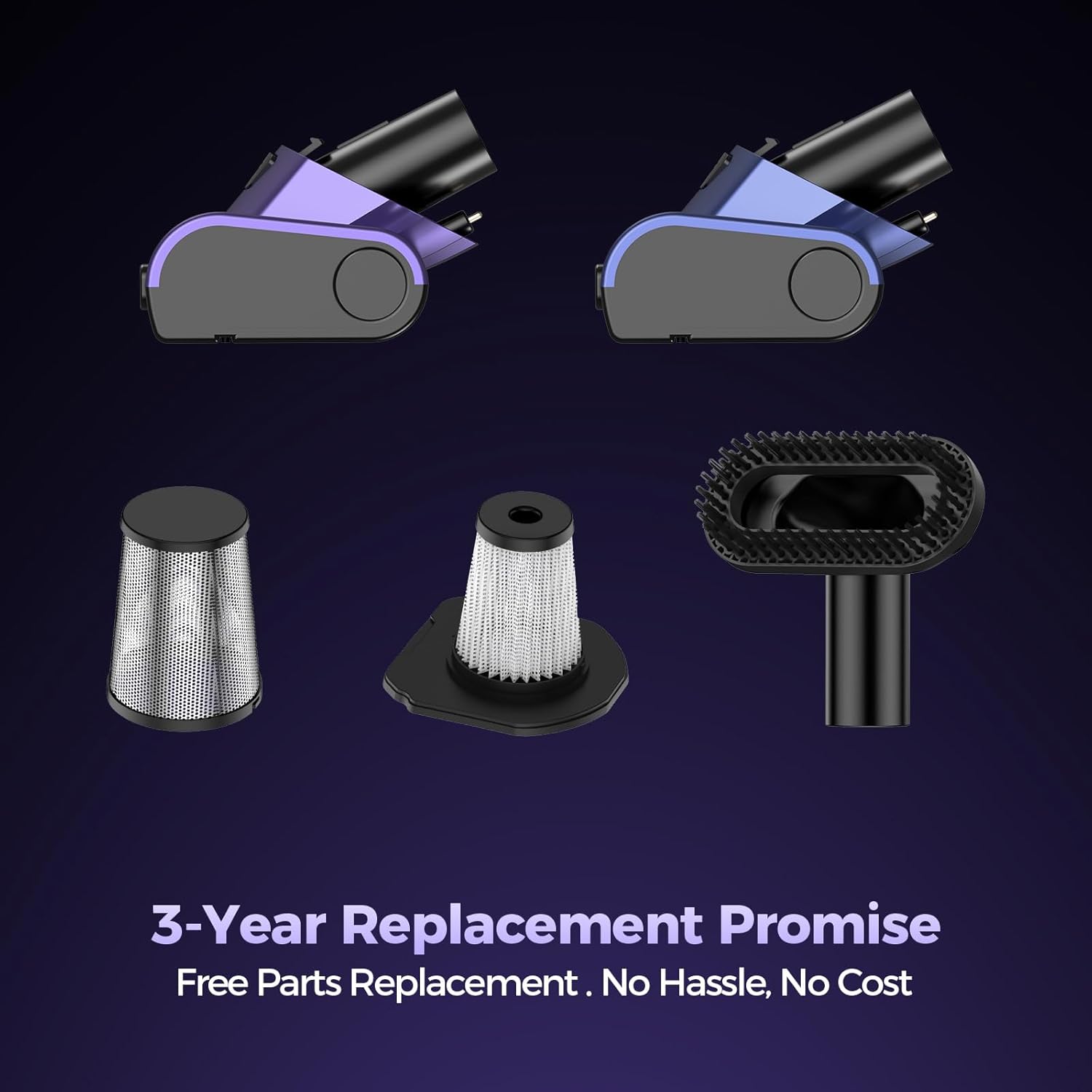 • PACKAGE ACCESSORIES: Various professional accessories, clean like a pro anytime, anywhere! Handheld vacuum x 1, Charging cable x 1, Automatic Rolling Brush x 1, HEPA Filter x 3, 2-in-1 Brush x 1, Long Suction Nozzle x 1, Flexible Hose x 1,User Manual x 1, Gift Box x 1. If you have any questions about the product, emailus and we will answer in 12 hours. We provide refund and exchange service due to quality problems.(3 years of free replacement parts service - such as brushes and filters)