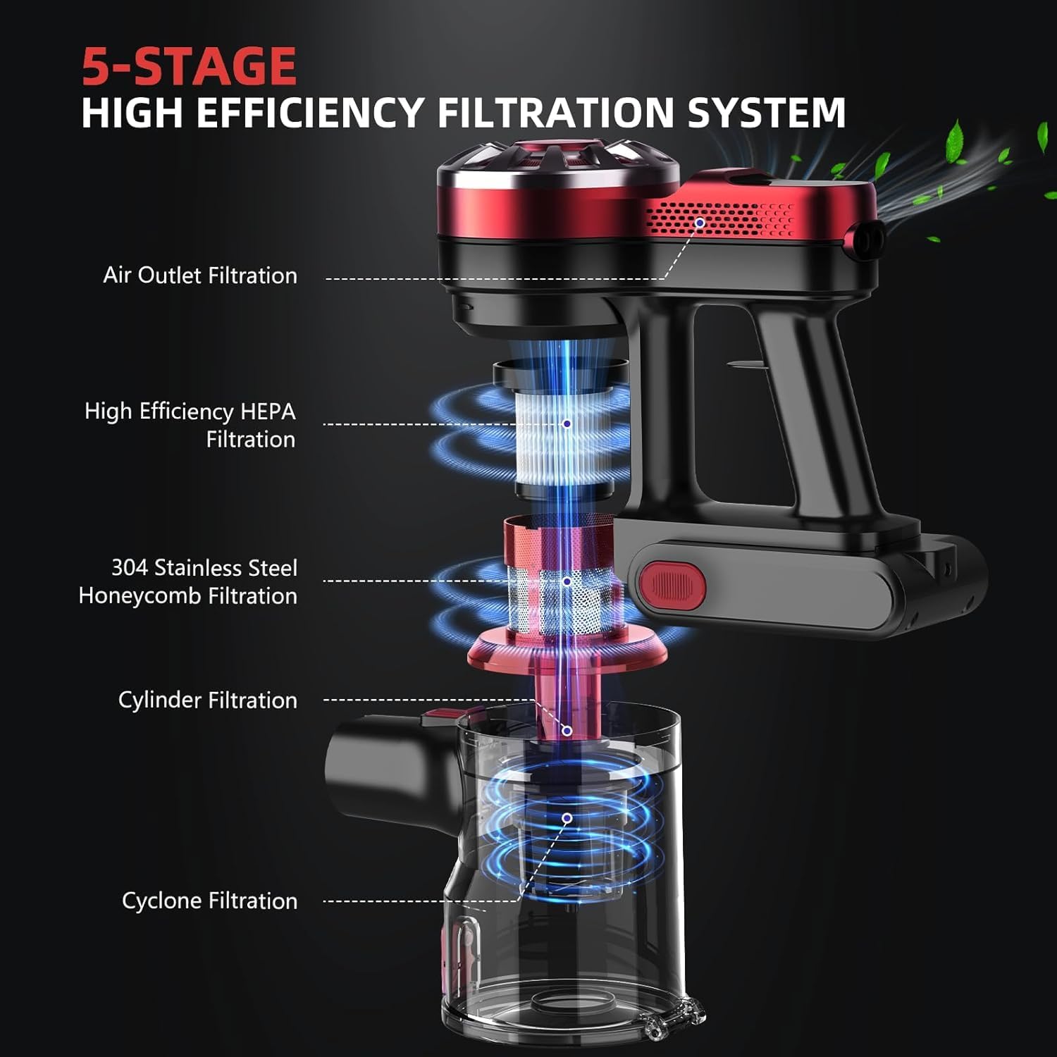 • EFFICIENT FILTRATION SYSTEM: This cordless vacuum cleaner is equipped with a 5-stage advanced filtration system, which can efficiently absorb 99.99% of dust particles to ensure cleaner air at home. The large-capacity dust cup meets a variety of cleaning needs, and the one-button emptying dust cup design avoids contact with dust and makes cleaning more hygienic.