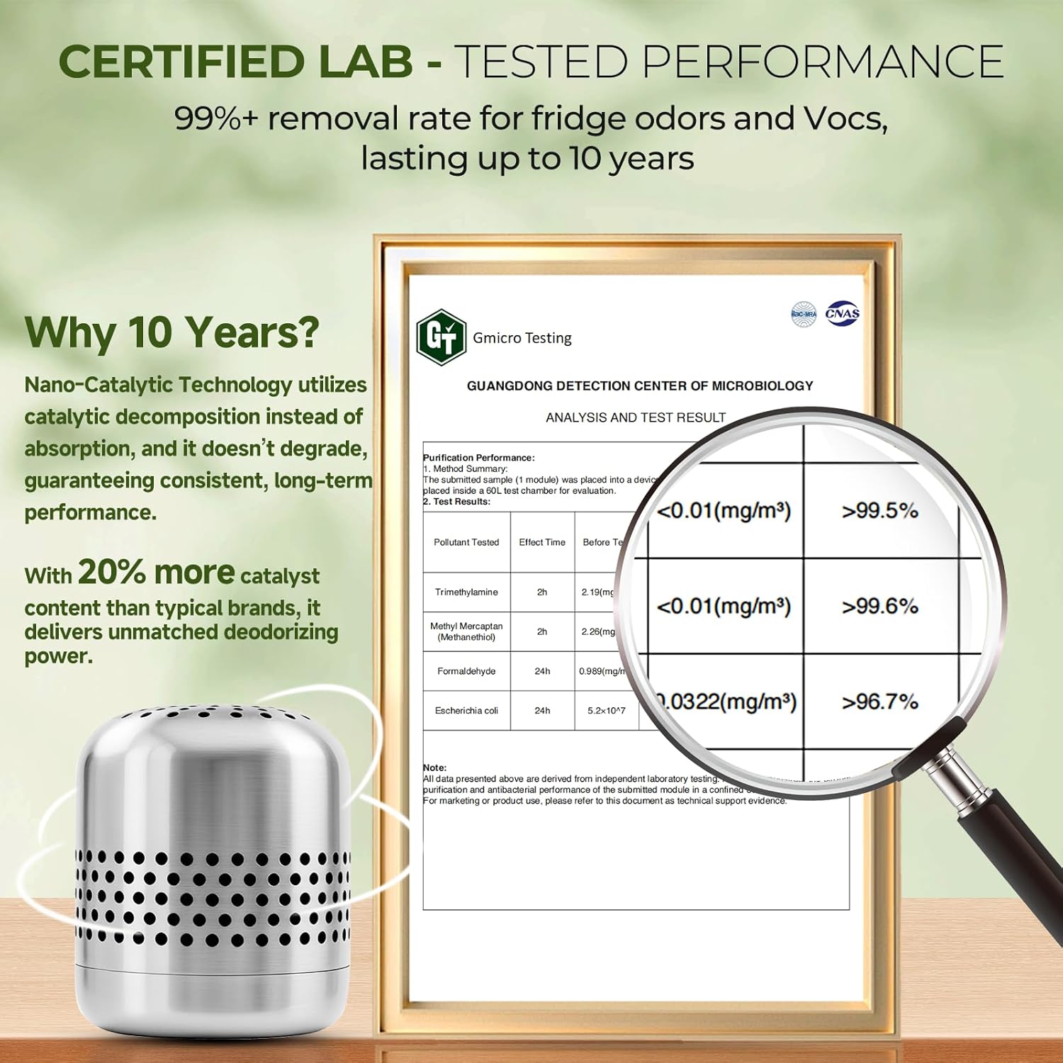 • 𝐔𝐩𝐠𝐫𝐚𝐝𝐞𝐝 𝐍𝐚𝐧𝐨 𝐂𝐚𝐭𝐚𝐥𝐲𝐭𝐢𝐜 𝐓𝐞𝐜𝐡𝐧𝐨𝐥𝐨𝐠𝐲 - No more lingering fridge odors. Powered by an advanced nano-catalyst, our fridge deodorizer actively breaks down harmful VOCs and neutralizes odor molecules at the source—eliminating smells instead of just absorbing them.
