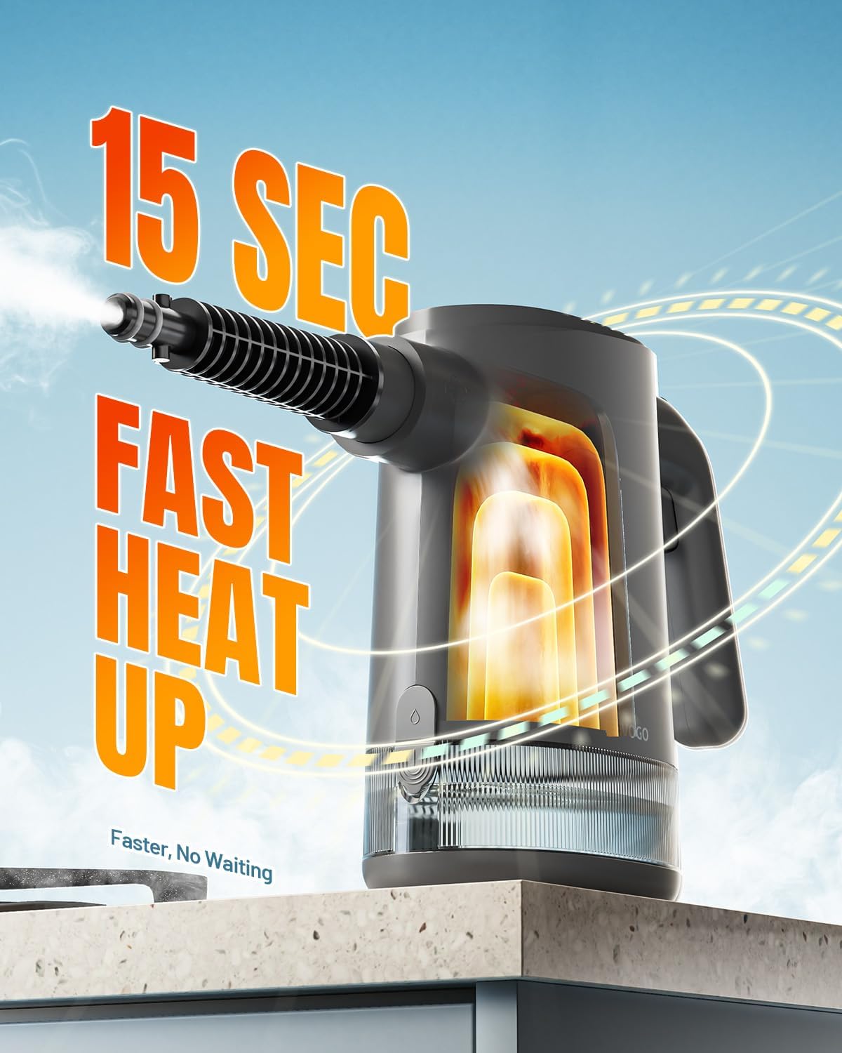 • Fast Heat-Up in 15 Seconds: The TEEVOGO handheld steam cleaner heats up in just 15 seconds, delivering 230°F high-temperature steam for immediate cleaning results. This hand held steam cleaner lets you skip the wait—just plug in and get powerful steam on demand with this professional steam cleaner for home