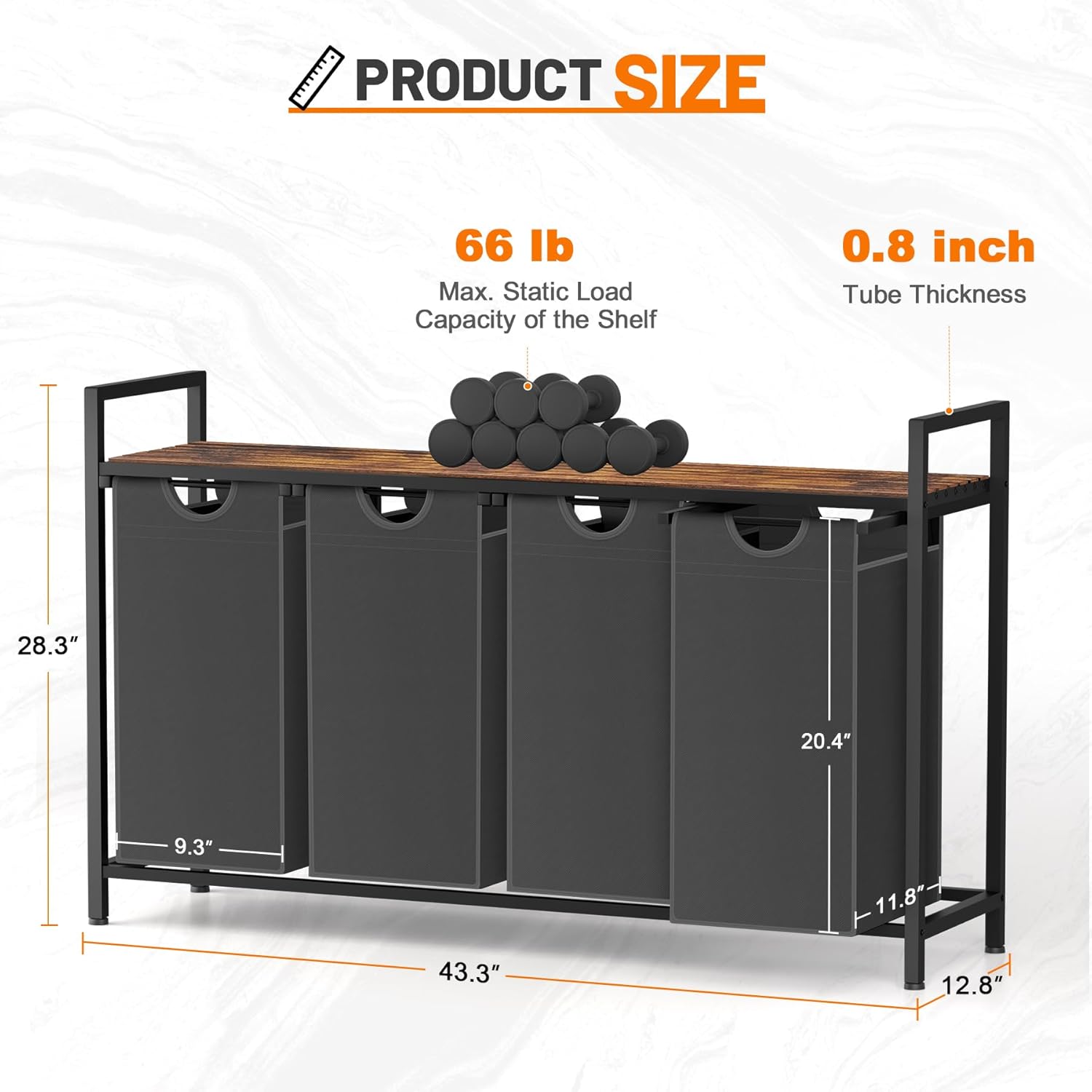 • Easy Assembly - The size of laundry basket is 43.3"D x12.8"W x 28.3"H. The laundry basket comes with a detailed instruction manual and all necessary tools and screws.