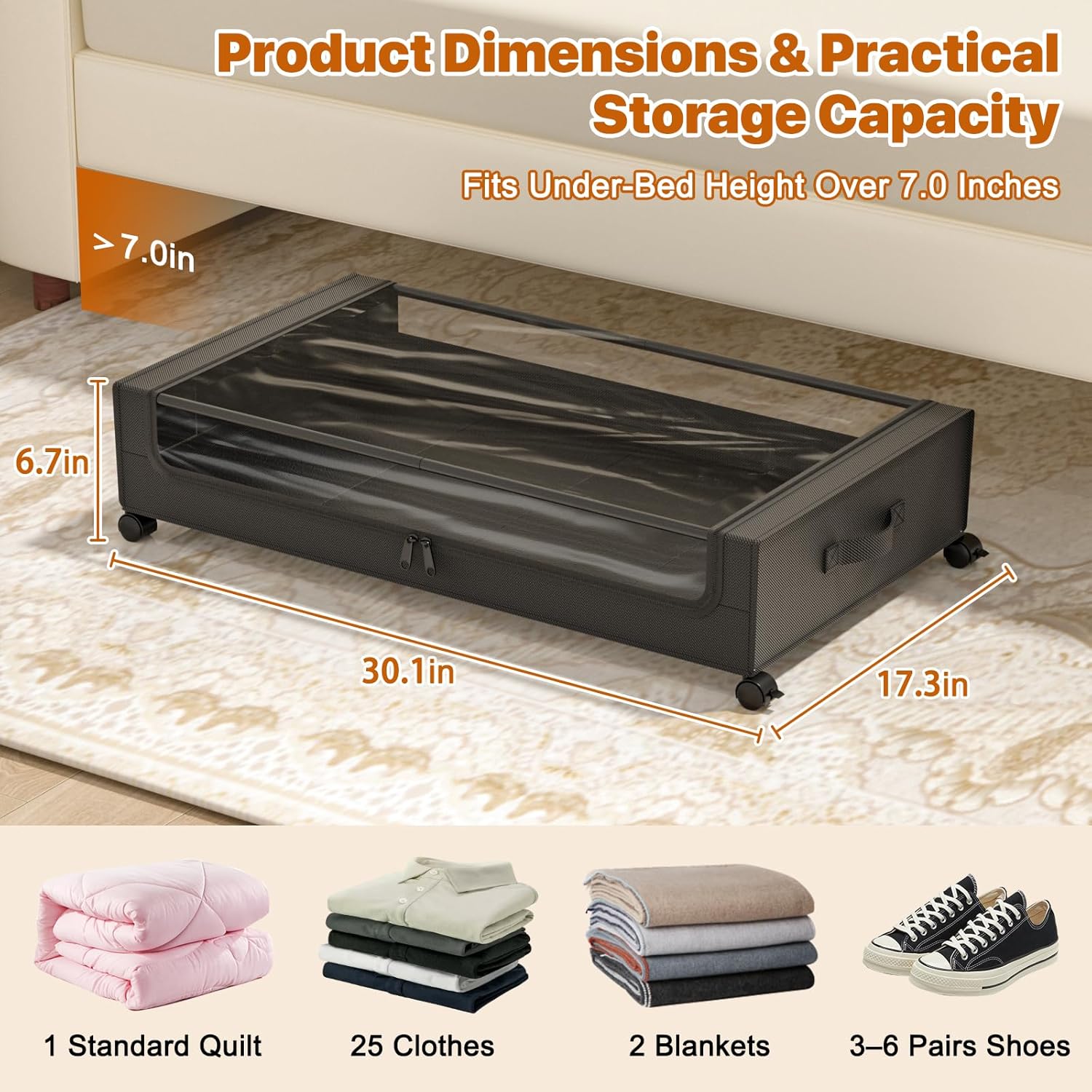 • Tough Build & Compact Design: The under-bed storage box uses a durable metal frame to withstand heavy loads while maintaining its original condition, ideal for long-term storage. The size of the storage unit is 31.5 x 17 x 6.3 inches (with wheels), suitable for under-bed heights greater than 6.9 inches. Its compact design allows it to be used under beds, sofas, shoe cabinets, tables, and closets to make the most of unused space.