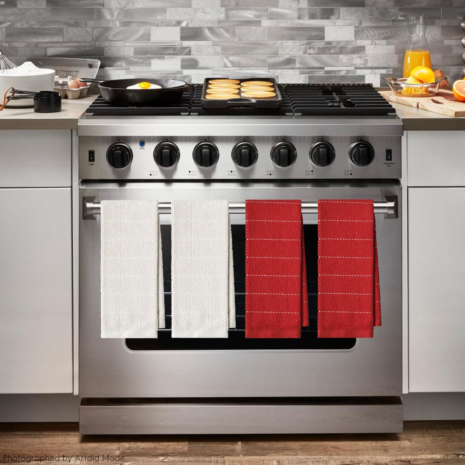 Artoid Mode Checkered Designed Cotton Beige Red Terry Kitchen Dish Towels, 15x25 Inch Soft Absorbent Quick Drying Cleaning Tea Towels Set of 4