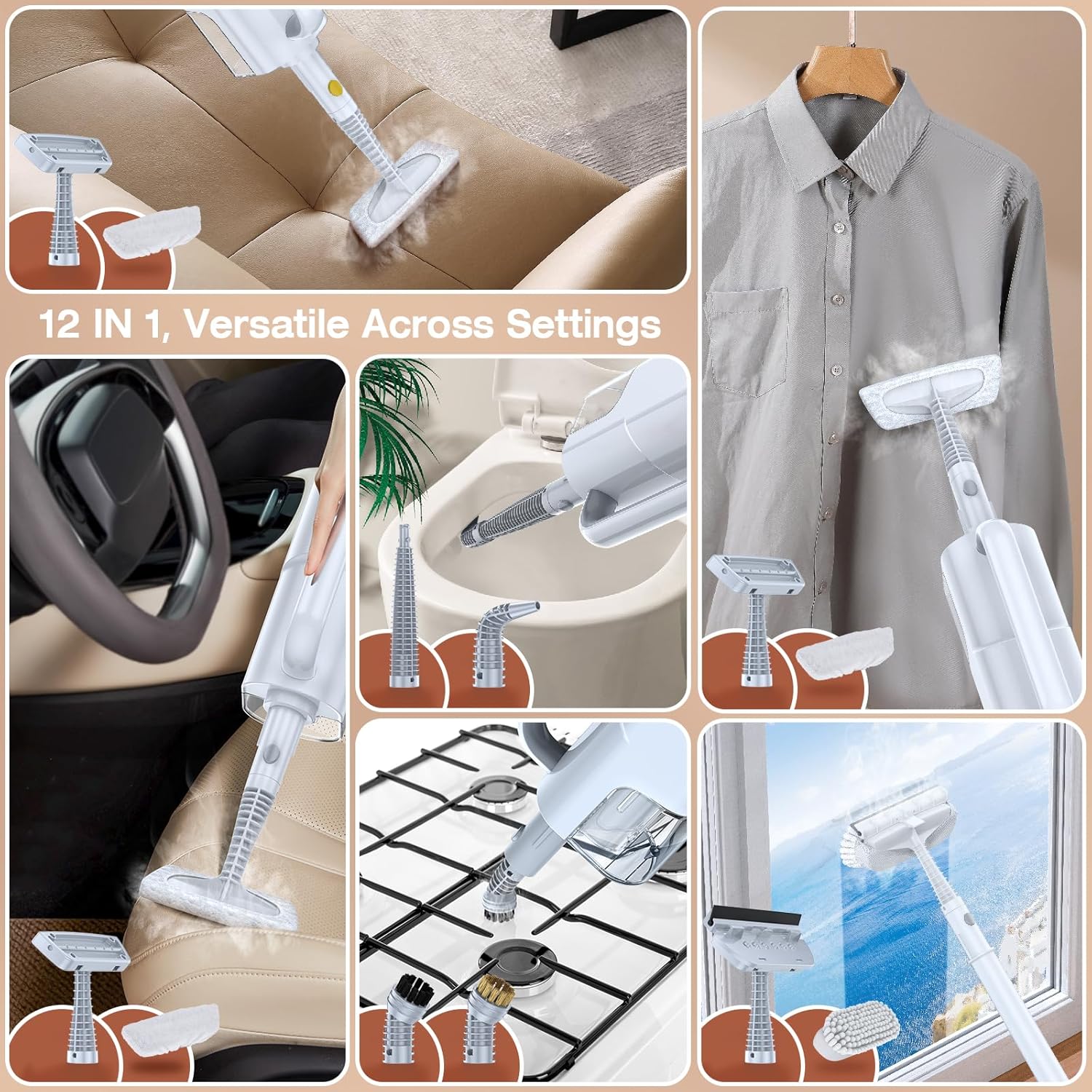 • 10-in-1 Multi-purpose Accessories and 350ml Water Tank: ScrubWiz steamer for cleaning equipped with 10 brush heads and 350ml water tank, steam mop not only simplifies floor and carpet cleaning tasks but can also be used for cleaning windows, clothing creases, gaps, stoves, sofas, grill and cars, providing a comprehensive cleaning experience