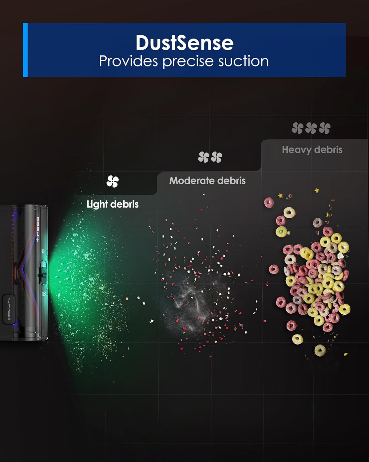 • 3DSense Pro Cleaning System: Powered by next-generation 3DSense Pro technology, this system delivers precise, targeted suction while detecting dust in real time. Advanced sensors instantly analyze the amount of debris on the surface, automatically adjusting suction power to match the cleaning needs