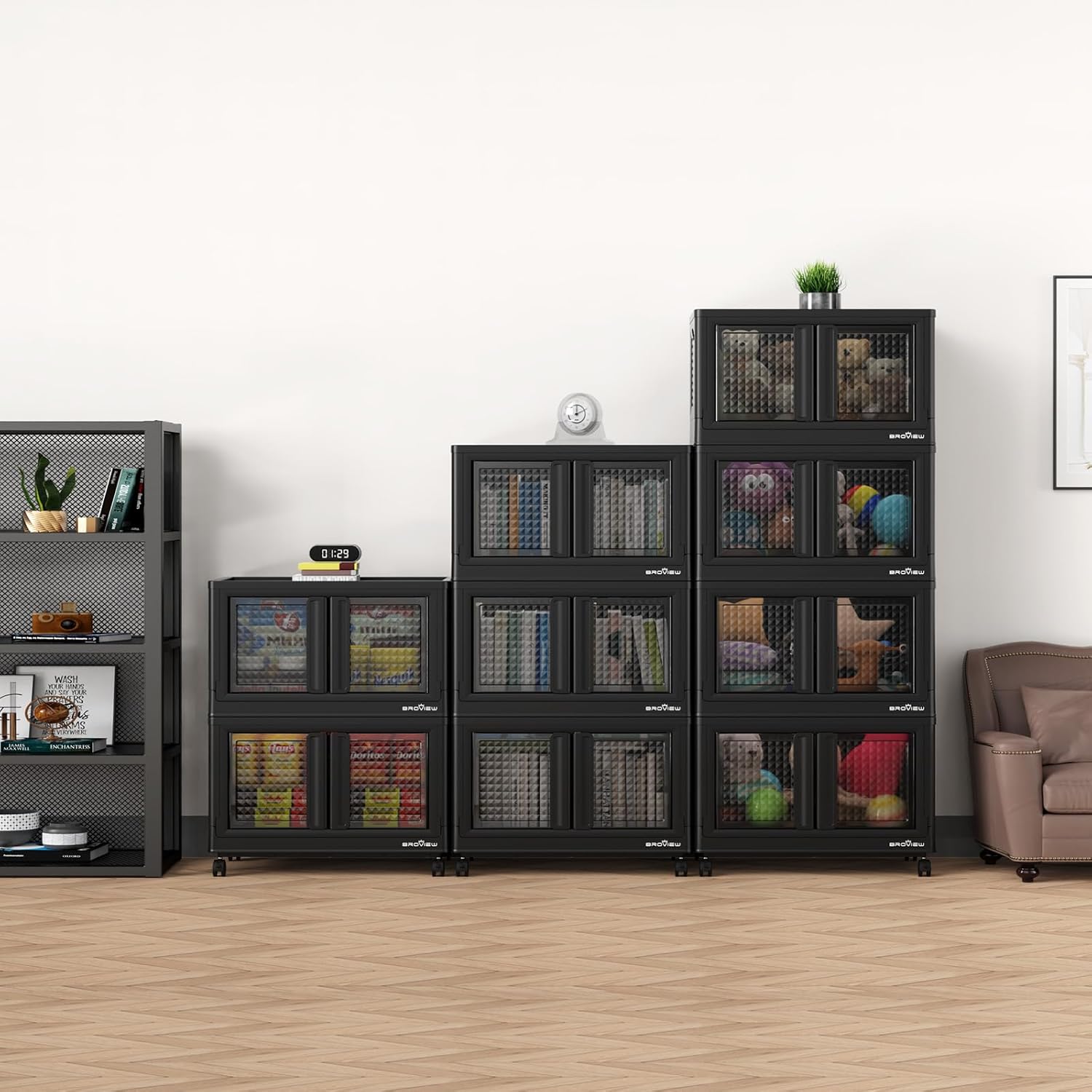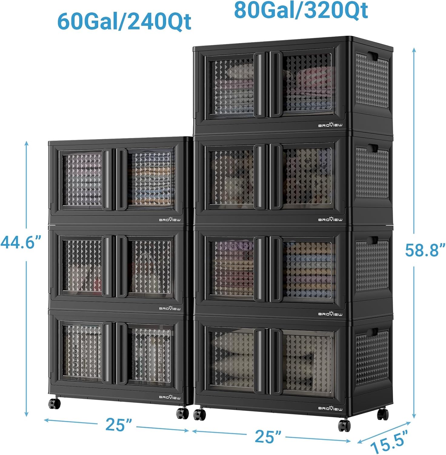BROVIEW 140Gal Stackable Storage Bins with Lids & Wheels, 560Qt Plastic Collapsible Closet Organizer and Storage Drawers, Storage Boxes Cabinets for Home, Office, 7 Pack, Black