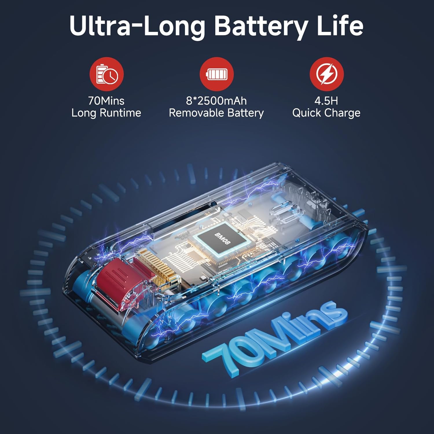 • Long-Lasting Detachable Battery for Uninterrupted Cleaning:Enjoy up to 70 minutes of cleaning time in Eco Mode with our cordless vacuum cleaner. The detachable battery allows you to charge it separately for maximum convenience, and its long-lasting performance ensures you can cover large areas in one go. Whether it's a quick tidy-up or an extensive vacuuming session, this rechargeable stick vacuum cordless has you covered