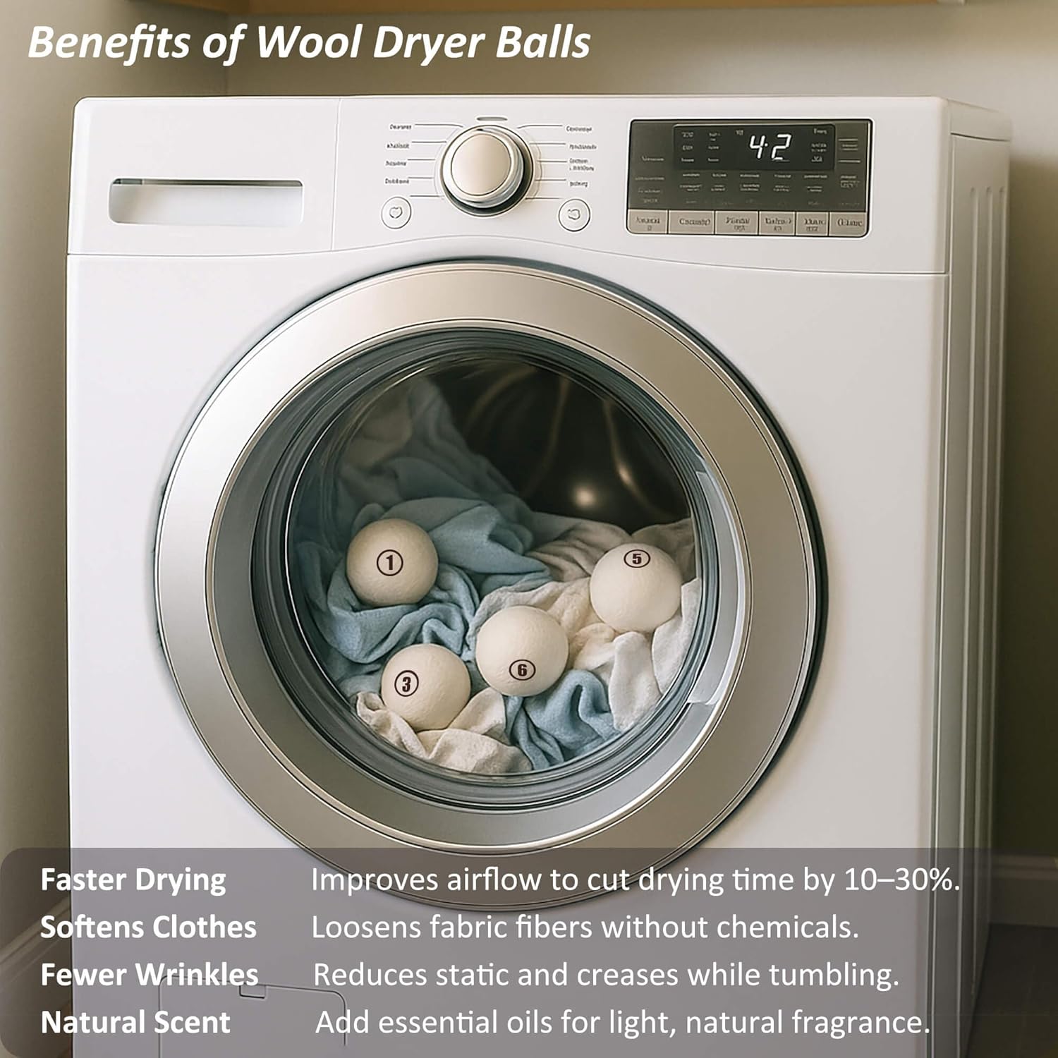 • ⏳ Saves Time & Energy – Cuts drying time by 20-40% (use 4 balls for small loads, 6 for large ones). Lower energy bills and faster laundry days!