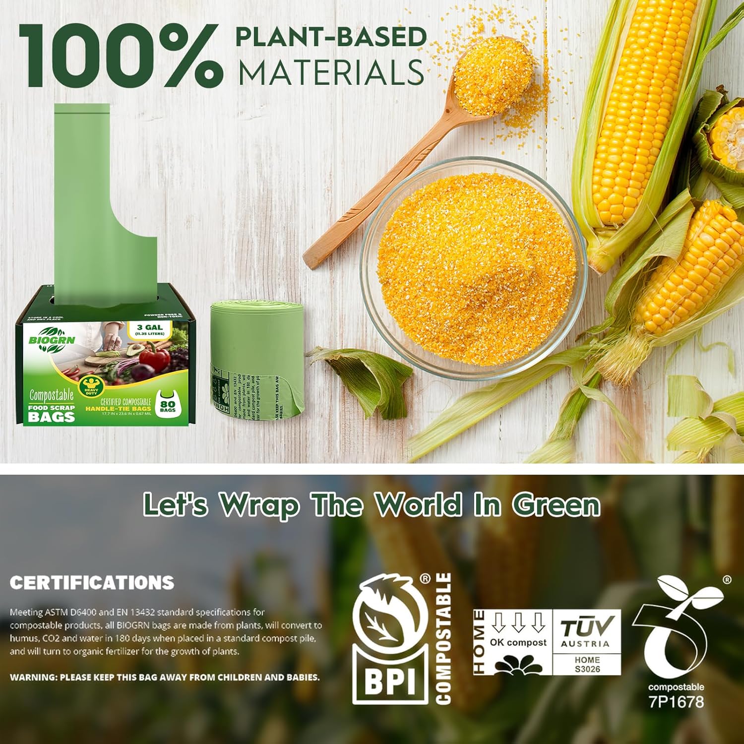 • Perfect 3-Gallon Compost Bags:These 3-gallon compostable trash bags (11.35L) measure 17.7" x 23.6" - the ideal size for countertop bins and food waste collection. Each roll contains 80 durable 0.67-mil thick bags with convenient handle ties for easy closure and carrying. Perfect as kitchen compost bags or for office waste disposal. Factory-tested to hold up to 22 lbs (10 kg), they offer sturdy strength for heavy waste while maintaining tear-proof durability.