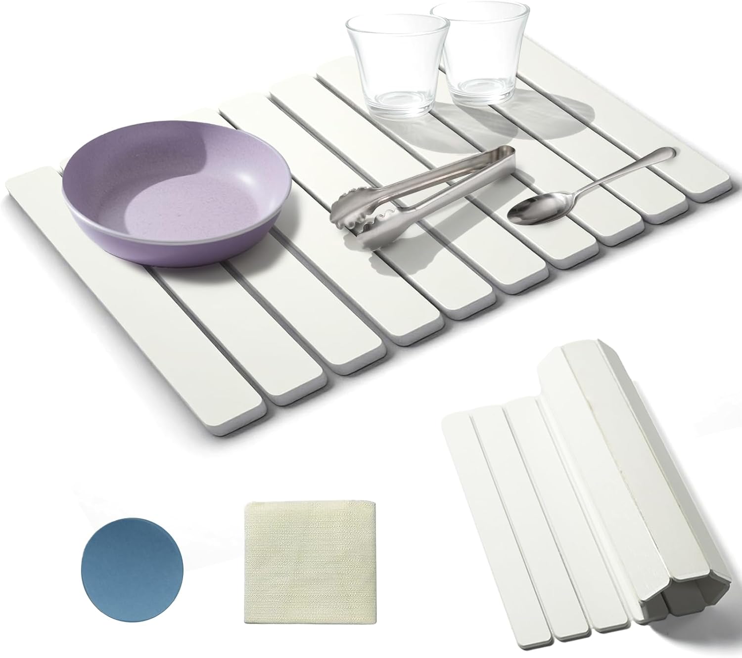 Dish Drying Mat, Diatomaceous Earth Absorbent Quick-Dry, Collapsible Stone Drying Mat for Kitchen Counter, Bath, Countertop, Dishes, Bottles, Cups, with Sandpaper & Non-slip Pad, 23"(L)x15.3"(W)