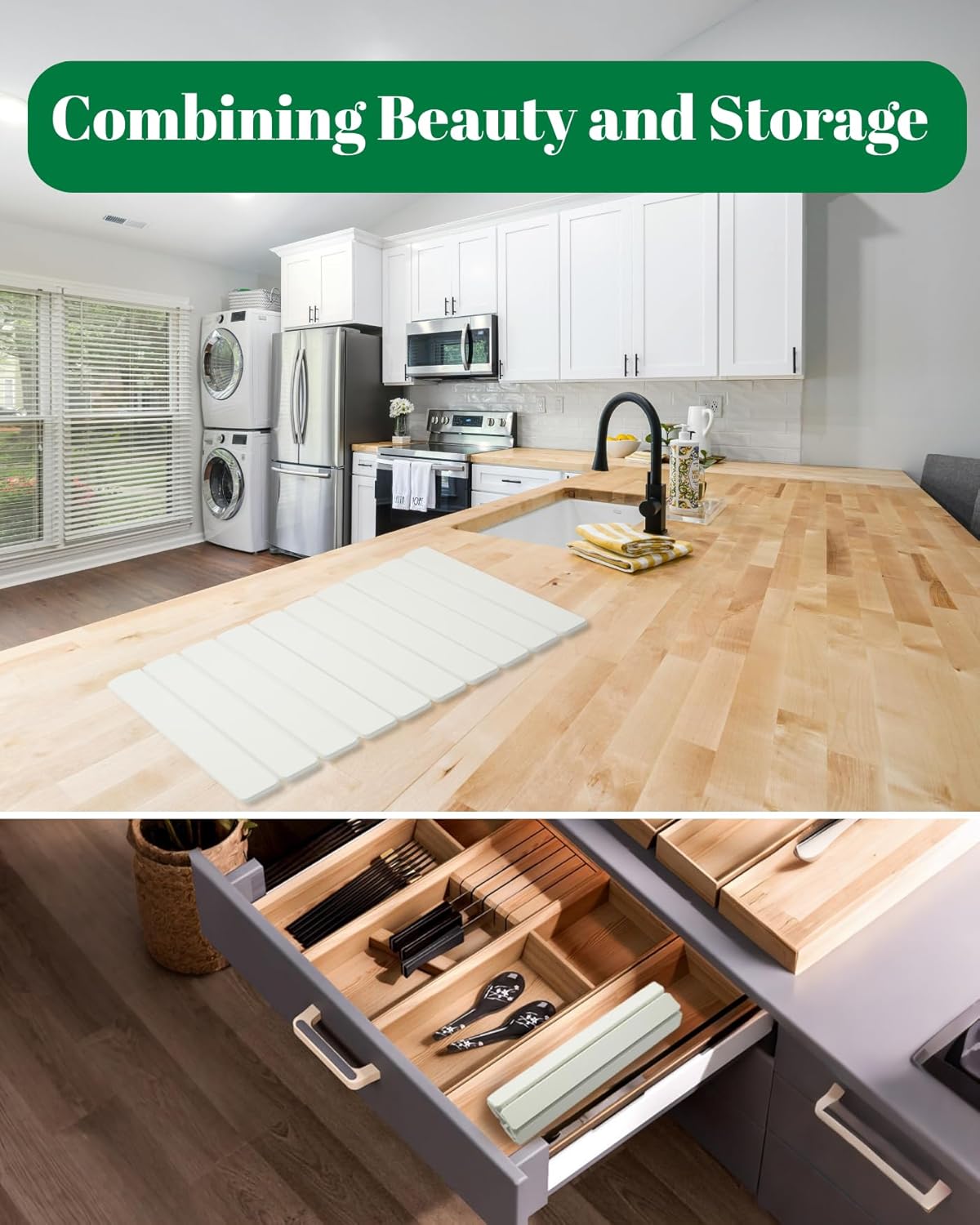 • Aesthetic and compact design - Size:23’’(L)*15.3’’(W). The foldable stone drying mat rolls up tightly for easy storage in a drawer. The foldable design takes up 70% less space than rigid racks. The exquisite white appearance suits various decoration styles, such as Bohemian, Coastal, Hamptons, modern, and Country cottage style