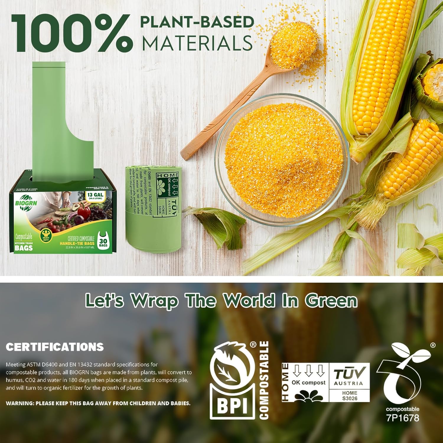 • Perfect 13 Gallon Kitchen Fit:These 13 gallon tall kitchen trash bags (22.8"x36.6") fit standard bins perfectly. Each roll contains 30 durable handle-tie compostable bags with 0.87 mil thickness - strong enough for daily kitchen waste yet eco-friendly. The convenient size handles both food scraps and household trash effortlessly.