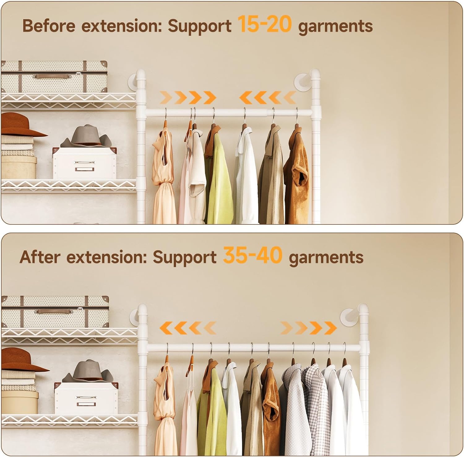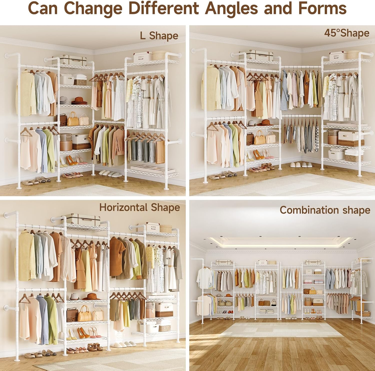 • Customizable & Modular Design : This closet organizer system allowing you to create a personalized storage solution to fit your space and needs. Adjustable angles (180° / 90° / 45°) to fit any room layout. Height-adjustable rods & shelves accommodate different clothing size. Use as a 3+0 or 2+1 wardrobe system for versatile storage