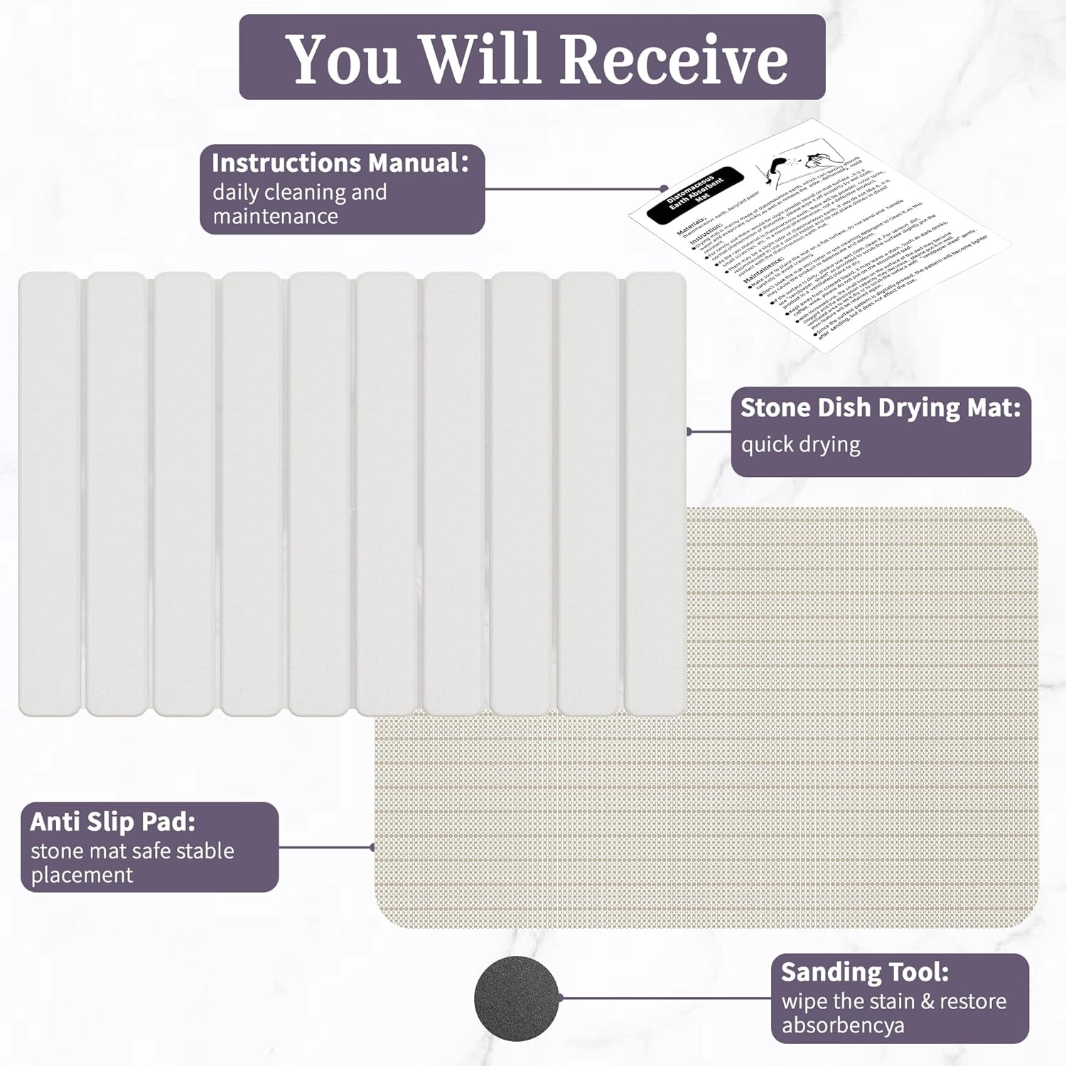 • 【Usage Tip】Avoid spilling dark liquids like coffee or red wine on your stone dish drying mat, as they may cause staining. For regular water marks, simply rinse with water and wipe with a damp cloth before air drying. For stubborn stains, gently sand the area with the included sandpaper or spot-treat with baking soda for quick restoration.