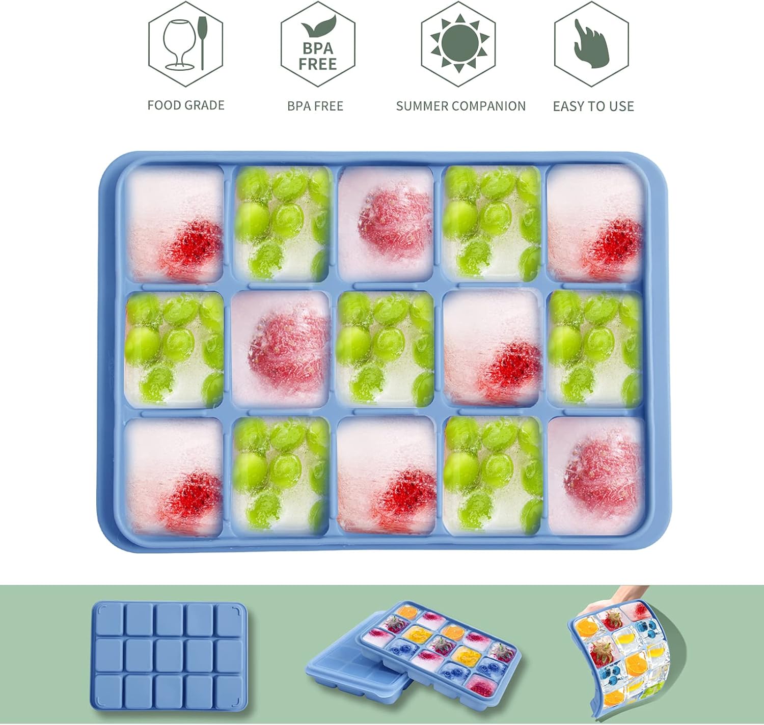 • Ice Cube Trays with Lids: Crafted from high-quality, flexible silicone, these trays easily twist and push up from the bottom to release perfectly shaped ice cubes. Each tray comes with a secure lid that seals tightly to lock in freshness and keep unwanted odors away in the freezer.
