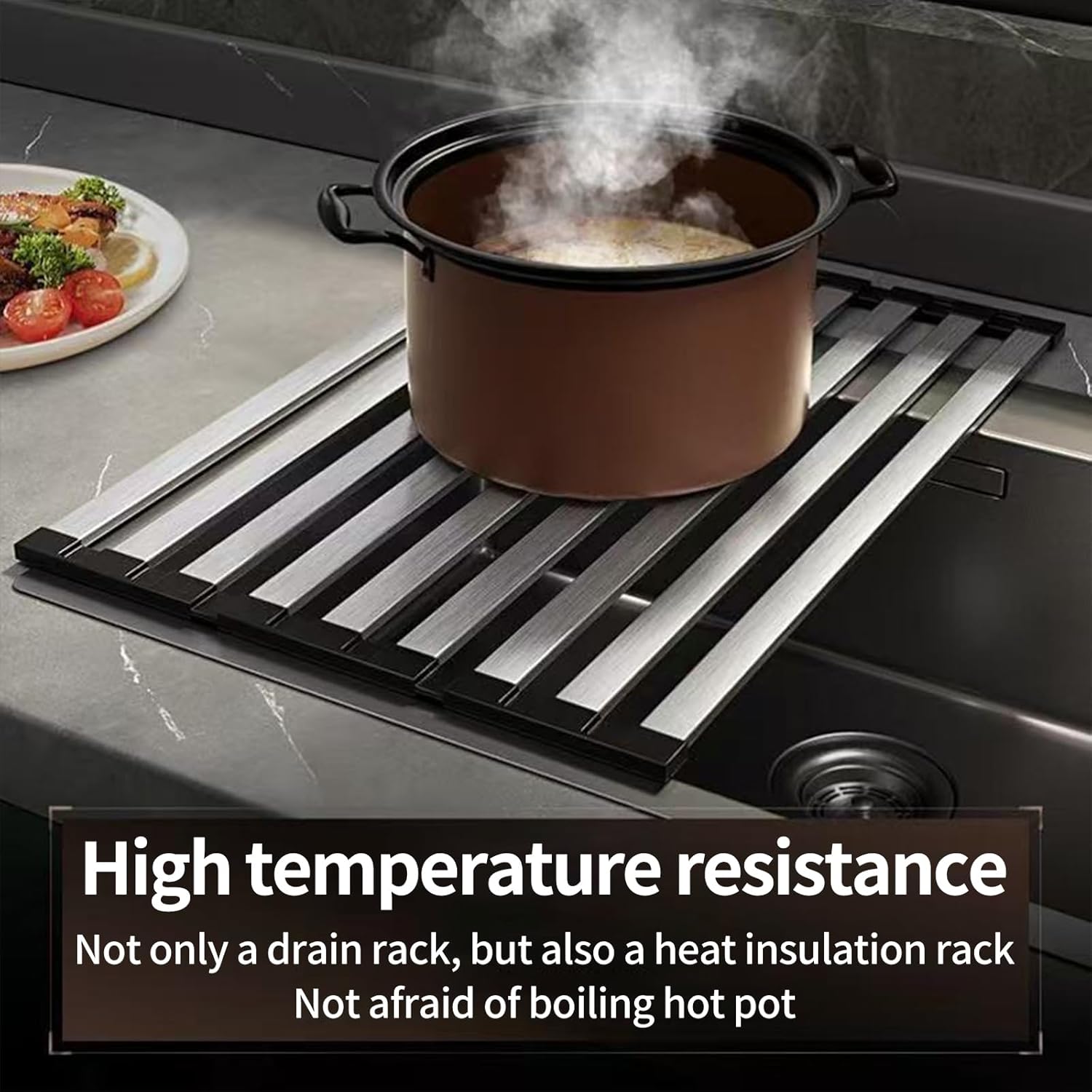 • 【Food grade materials】The foldable parts at both ends of the sink cover are made of silicone, which provides softness, rust resistance, non-slip resistance and water resistance.The middle part is made of stainless steel, with a strong structure, easy to clean, and not easy to bend or warp under heavy kitchen utensils.