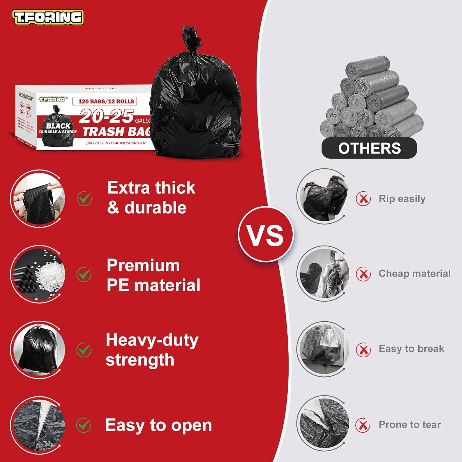• 【DEPENDABLE FOR DAILY USE】Crafted from reliable material that resists tears from everyday household waste like packaging, paper, and bathroom trash. Offers peace of mind for common cleanup tasks.