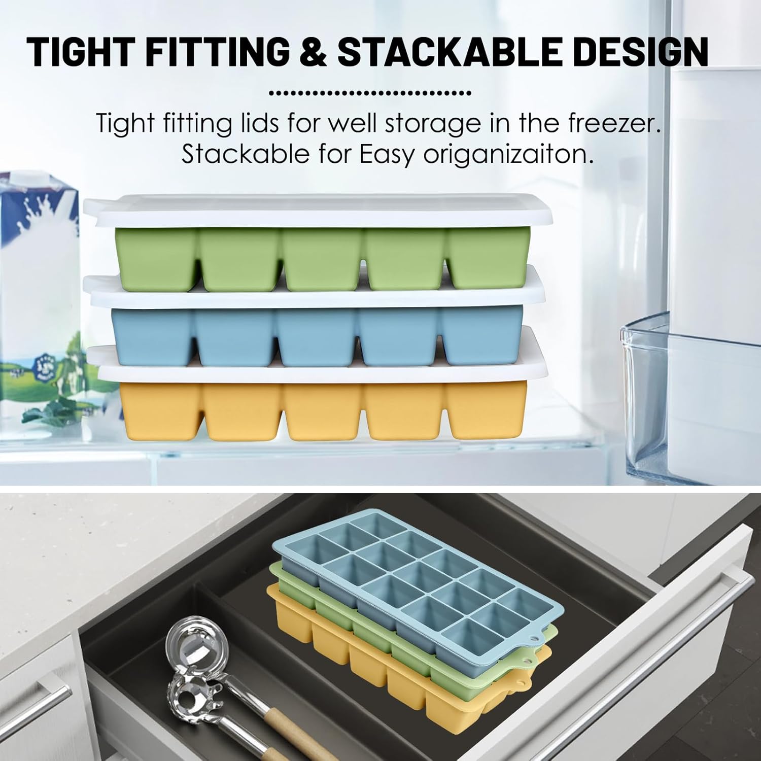 • Ice Cube Molds with Lid; covered with silicone lid, prevents ice cube/food from absorbing the fridge odor, you can get fresh and clean food or ice. These whiskey ice maker with lid can be easily stacked and will make the freezer neat and spacious