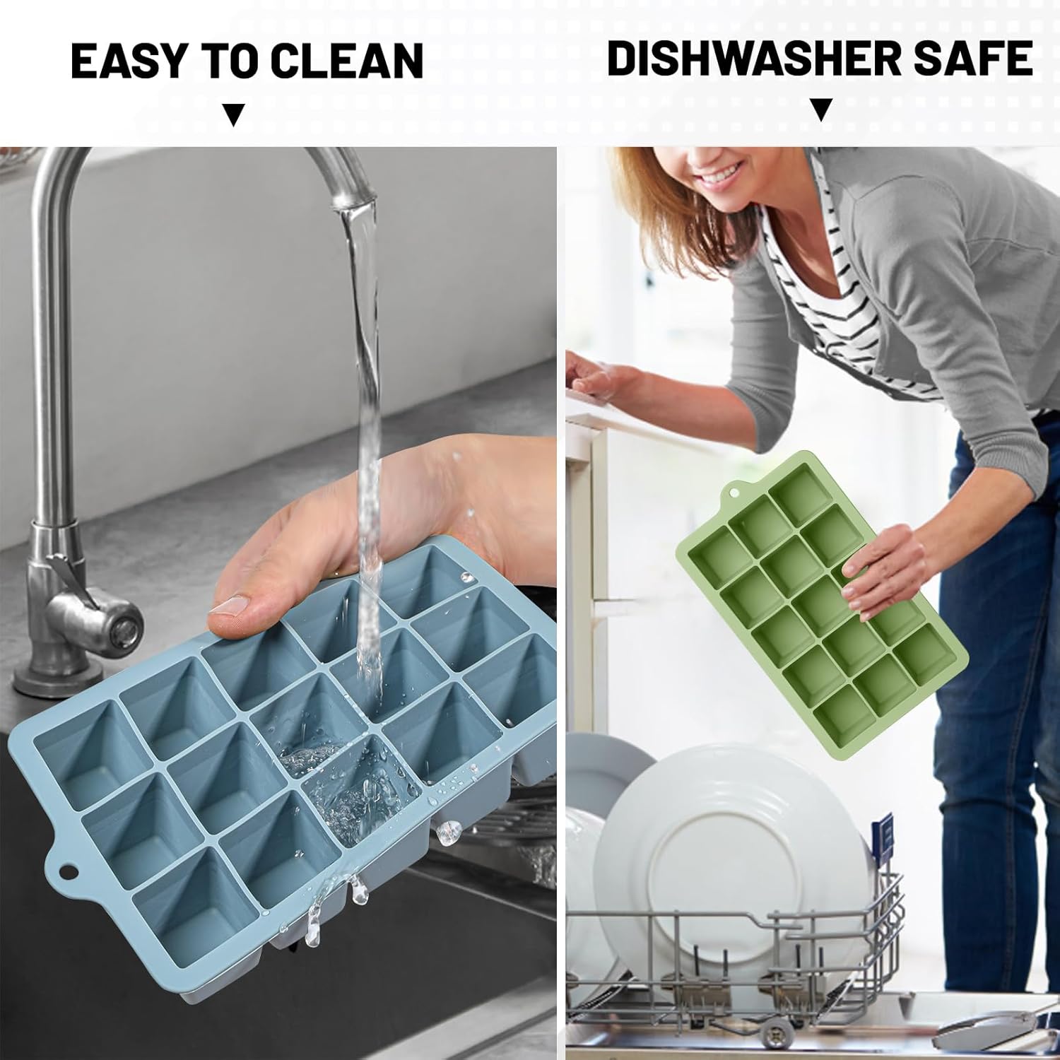 • Easy Release Ice Cube Tray; Soft silicone material and independent cavity design make it easy to release ice, you can push from the bottom to remove ice cubes for whiskey. Square ice cube trays has a non-sticky flexible surface, it is very easy to clean, dishwasher safe