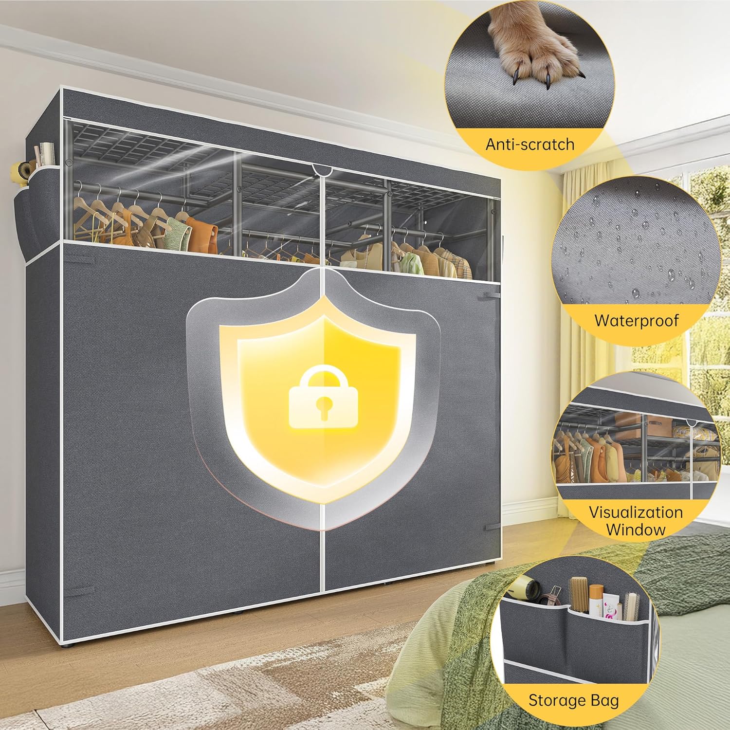 • Premium Protective Cover with Side Pockets: The heavy duty zippered cover of clothes rack with cover protects clothes from scratches and sunlight.Reinforced side pockets store small items like socks, belts, and accessories, keeping them within easy reach.