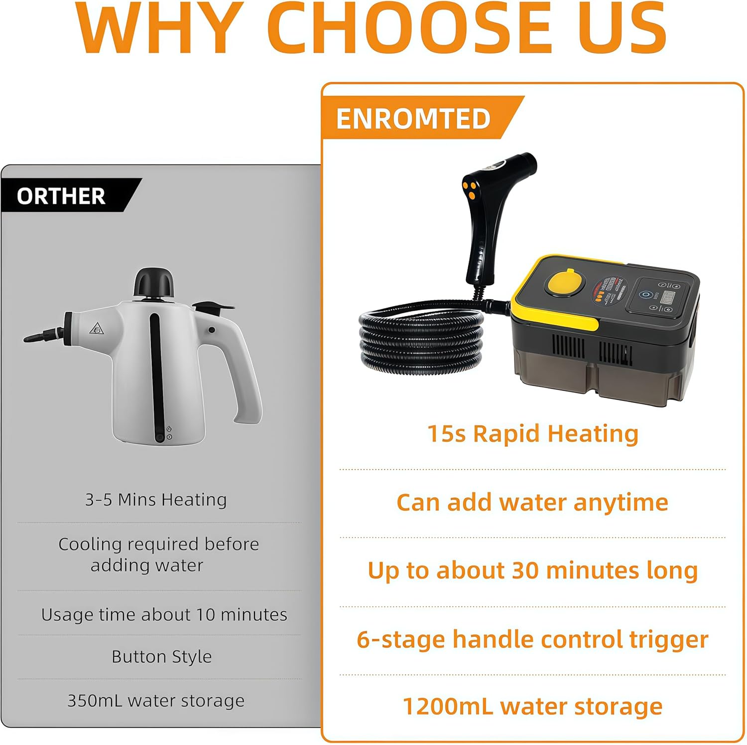 • Enjoy 45–60 minutes of continuous steam cleaning with the extra-large 1200ML tank—no more frequent refilling! Perfect for deep cleaning furniture, car interiors, and tough home stains, this pressurized handheld steam cleaner delivers powerful, long-lasting performance for versatile use anywhere.