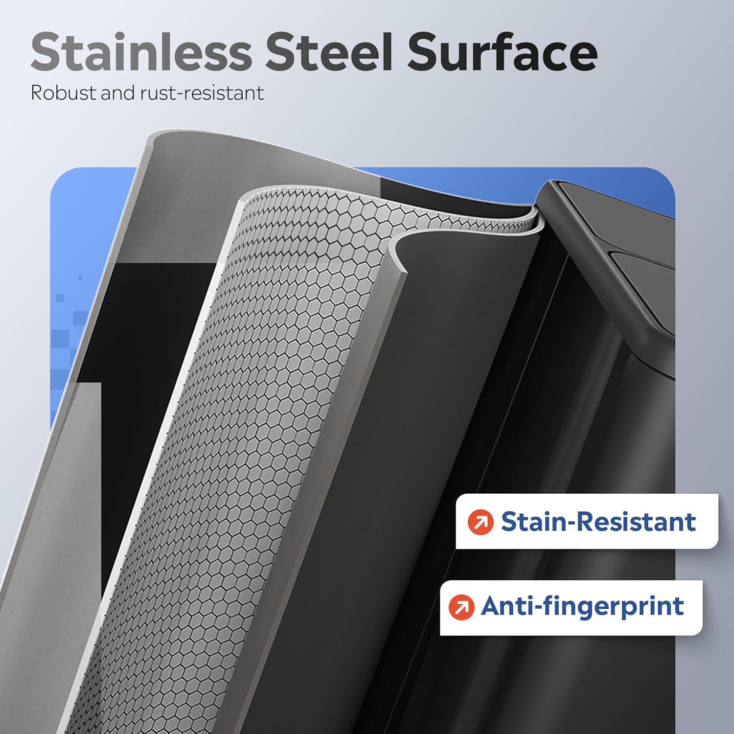 • 【Modern Kitchen Upgrade】A brushed silver/black finish and minimalist design elevate your space. The trash can’s fingerprint-proof steel and seamless lids blend functionality with style, keeping your kitchen looking tidy and polished.