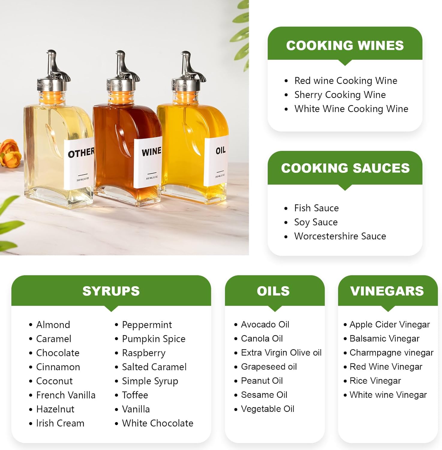 • Versatile and Elegant: Oil bottle dispenser and lid have good leakproof and airtight effects. This glass bottle dispenser can be used to hold cooking oil, vinegar, soy sauce, cooking wine, coconut milk, vegetable oil, balsamic vinegar and more