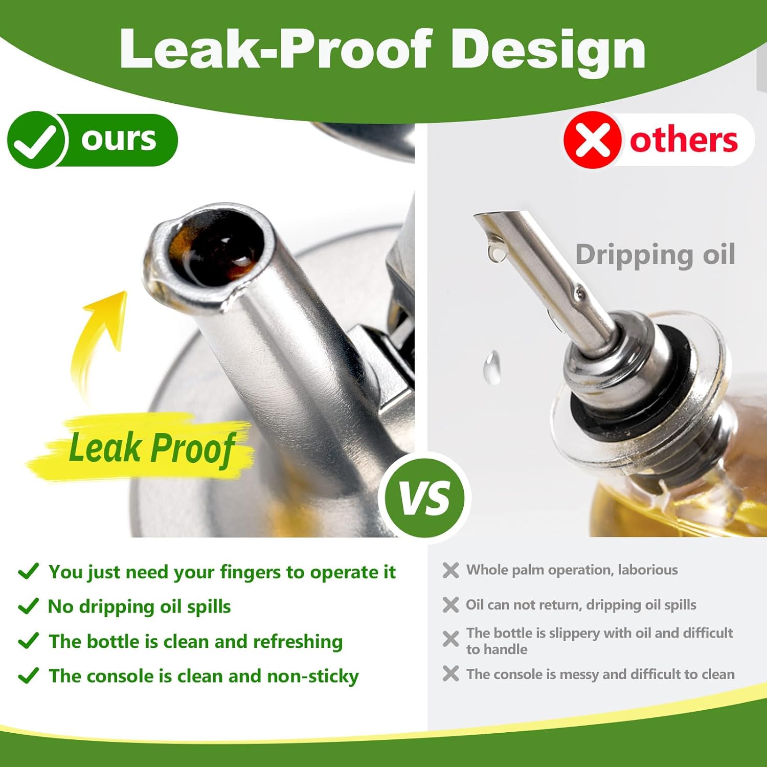 • Leak Proof Spout: This oil dispenser is designed with stainless steel pour spouts, sealed cap and flap cap that prevents oil from leaking and also keeps dust from contaminating the liquid. Keep your olive oil fresh
