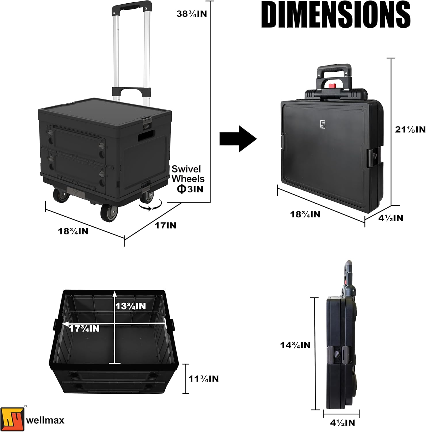 Wellmax WM99800BK Rolling Crate Cart with Wheels, Foldable Utility Cart for Teachers, Shopping, Office | Silent Wheels, Aluminum Handle, 132 lbs Capacity – Black