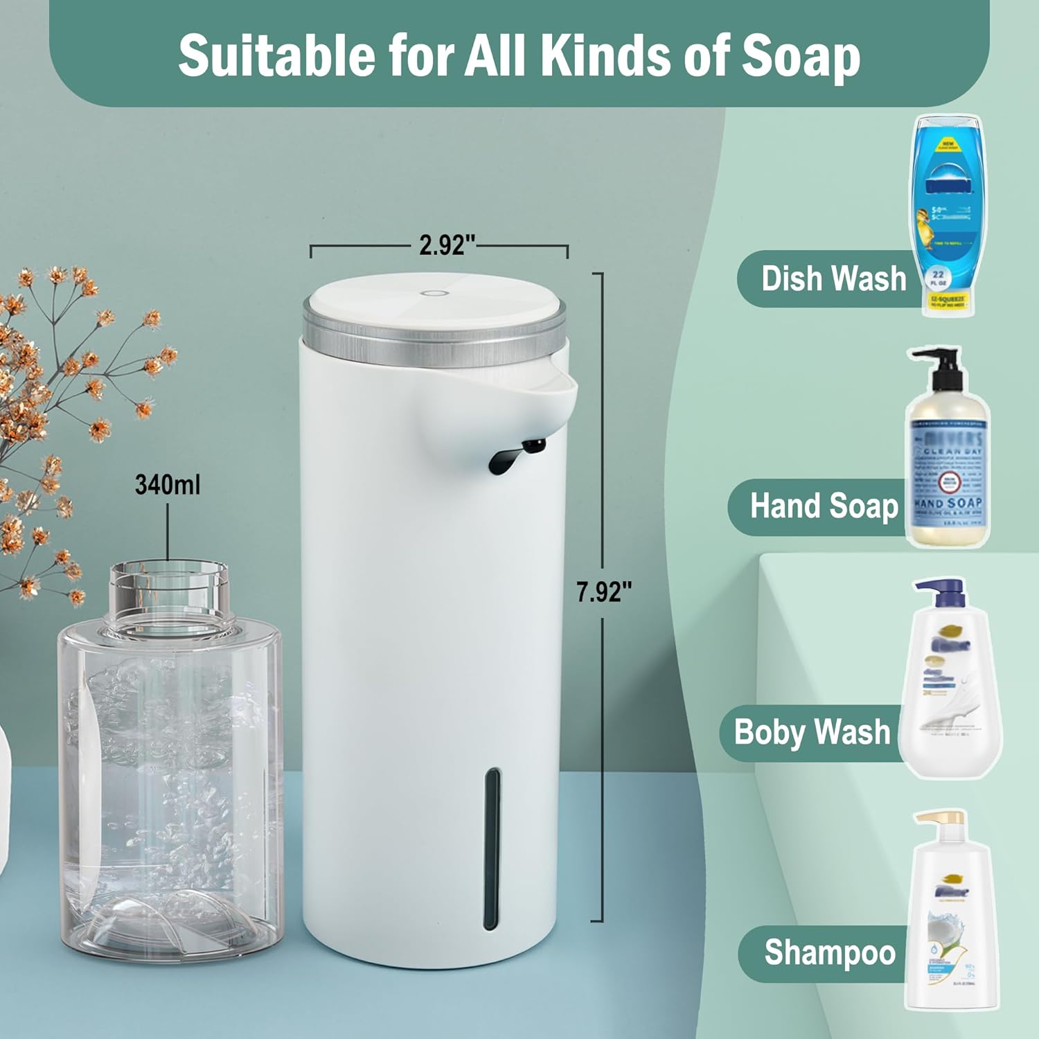 • 【Suitable for a Variety of Soaps】You can directly add liquid soap such as hand soap, dish soap, shampoo, body wash, etc. Please note to not add foaming soap. Equipped with a 340ml large soap container, you don't have to worry about frequently adding soap. Additionally, the machine is designed with a visual window on the outside for you to monitor the soap level at any time and refill it promptly. We believe this automatic liquid soap dispenser is your best choice.