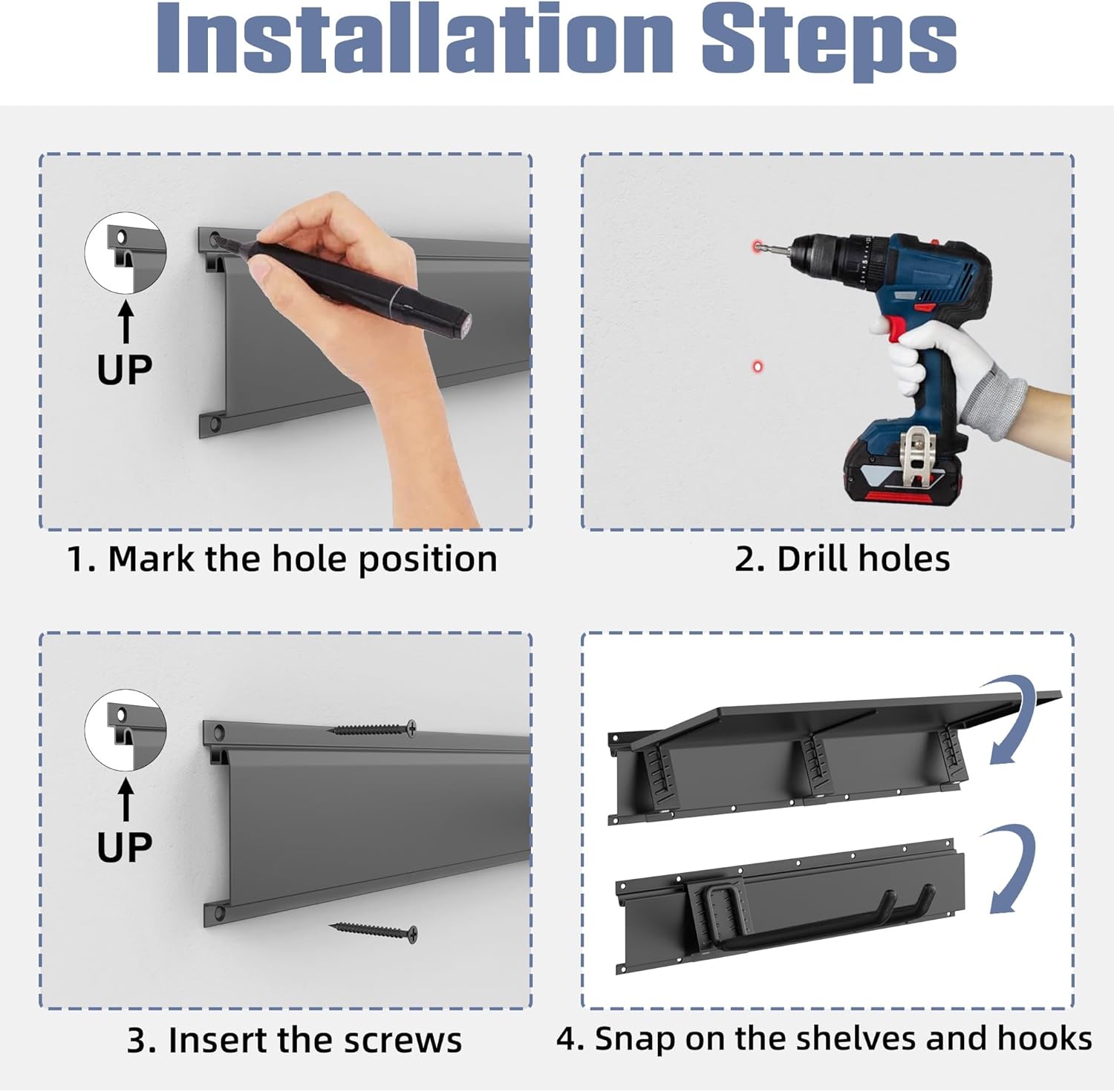 • Flexible and Adjustable Storage: Includes 4 tracks, allowing you to easily position hooks and shelves to create a customized setup that suits your specific storage needs