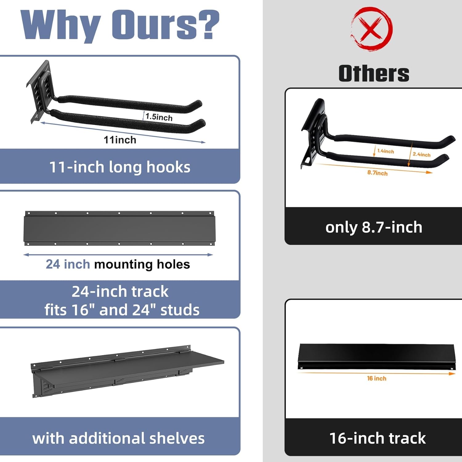 • Easy Installation: Comes with four 24" tracks featuring pre-drilled 16" and 24" mounting holes for secure installation on standard 16" and 24" wall studs. Arrange the tracks to best fit your space