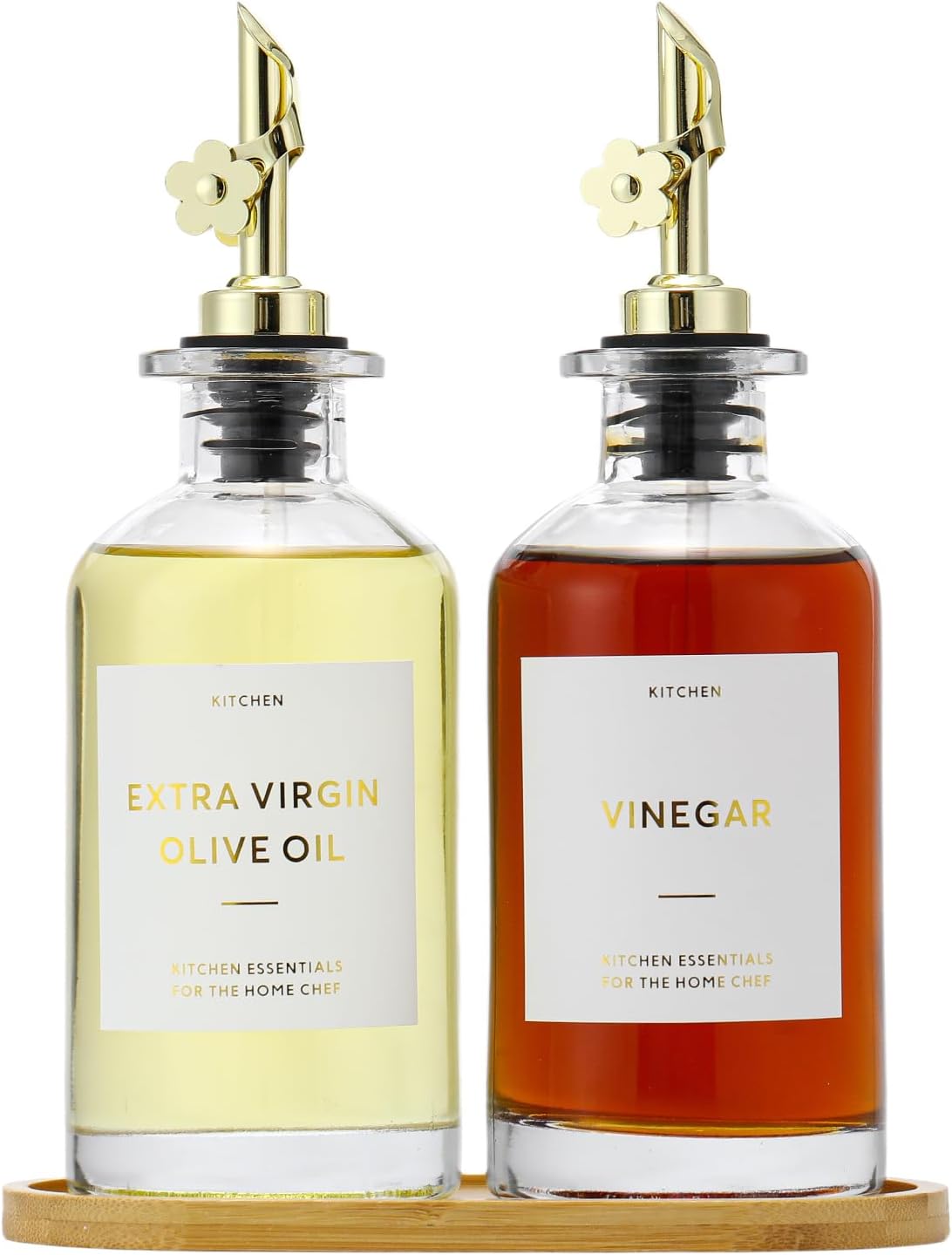 • IDEAL GIFT - Whether you are looking for oil dispenser bottle or kitchen accessories, this olive oil and vinegar dispenser bottle set is your best choice. It's also a perfect gift for your mother, family and friends, housewarming gift and Christmas gifts.