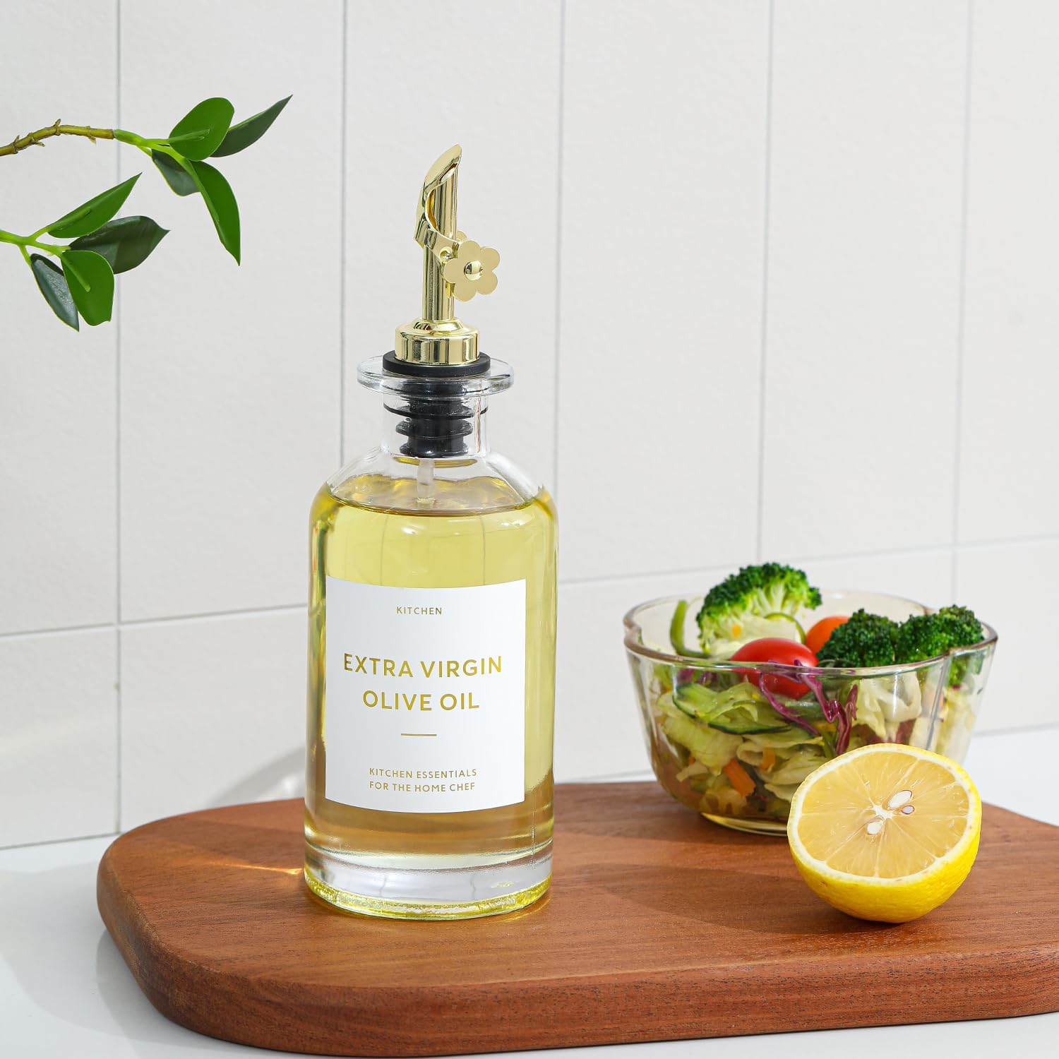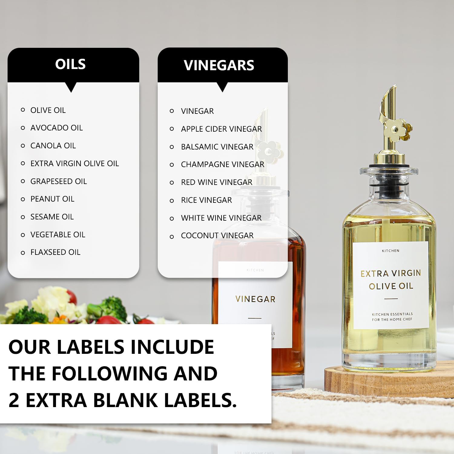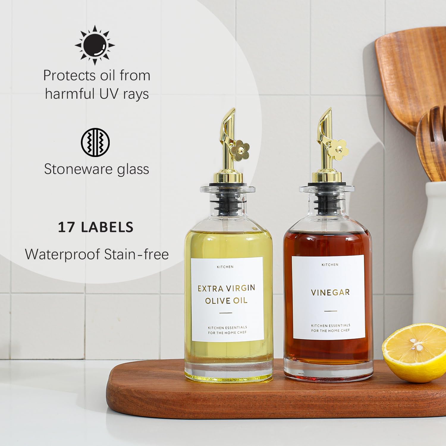 • KITCHEN OLIVE OIL BOTTLES – The oil and vinegar dispenser set contains 2 transparent 11.8oz (350ML) glass bottles, 2 gold stainless steel oil spouts, 17 gold waterproof labels(kinds of oil and vinegar) and a bamboo tray, Ideal for safely store and dispense your olive oil and vinegar.