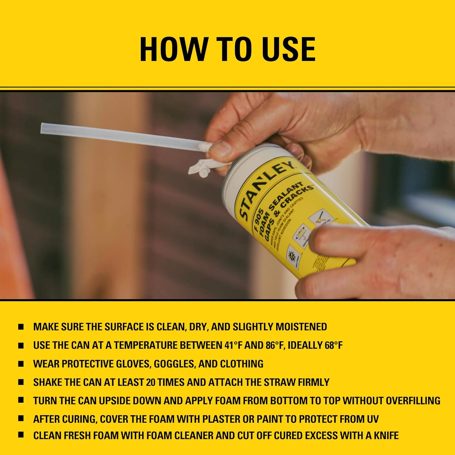 • VERSATILE EXPANDING FOAM SPRAY: Stanley F905 is a polyurethane foam formulated to fill and seal gaps, cracks, and cavities up to 3 inches wide. Designed for DIYers and pros alike, it's ideal for use around windows, doors, pipes, and wall penetrations.