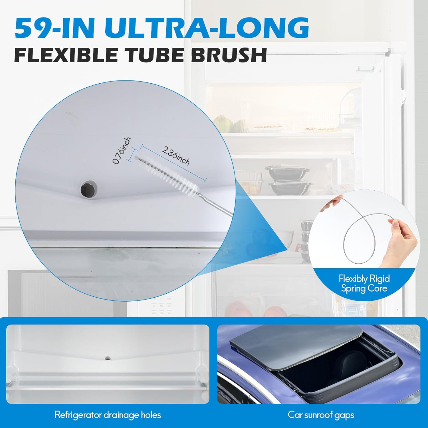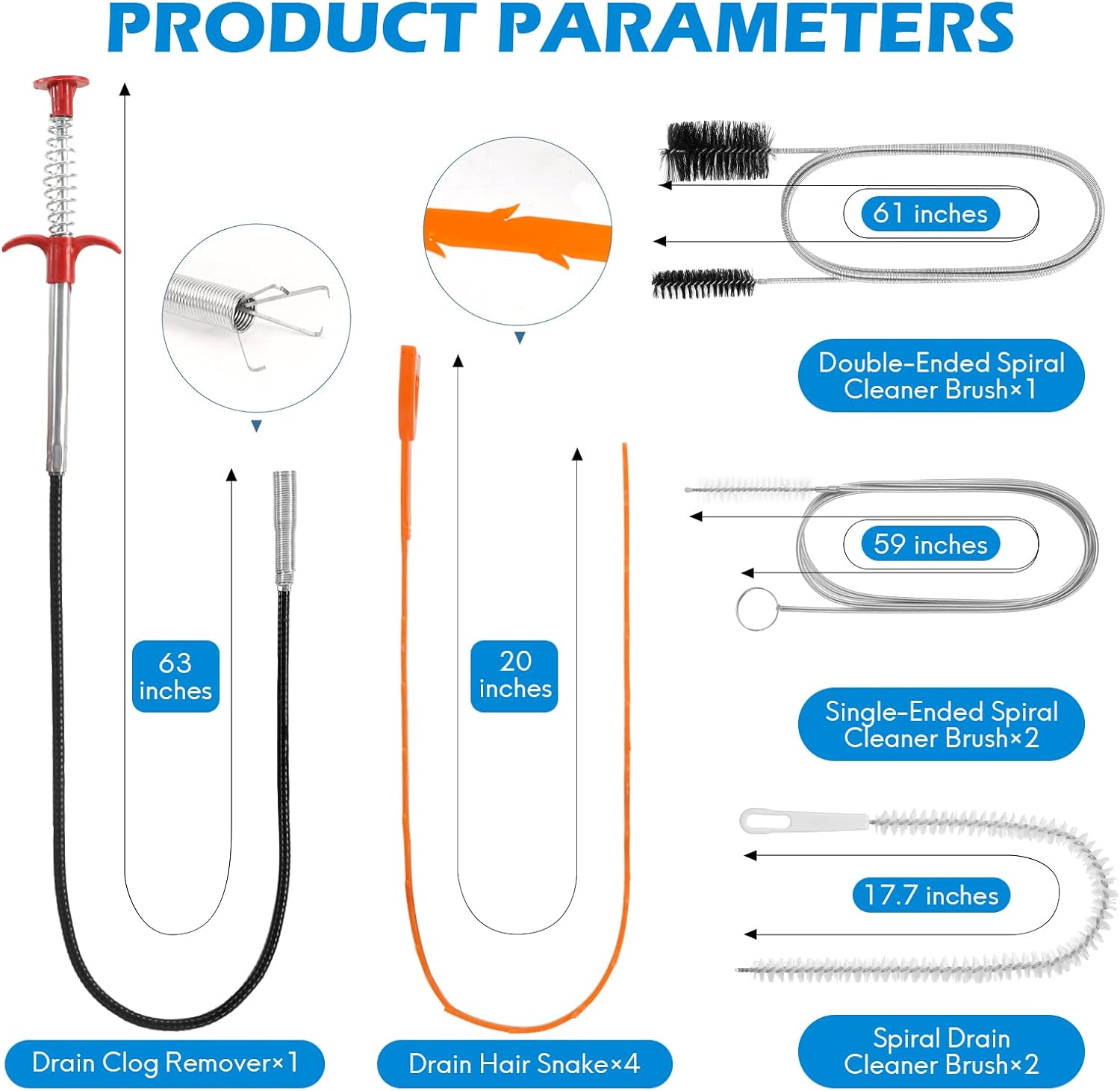 • 【WIDELY FUNCTIONAL】Bendable 20-inch drain snake with barb hooks extracts hair clogs deep in pipes, working as an effective hair drain clog remover; spiral and spring drain cleaning brushes work on fridge drains, car sunroof tubes & aquarium lines