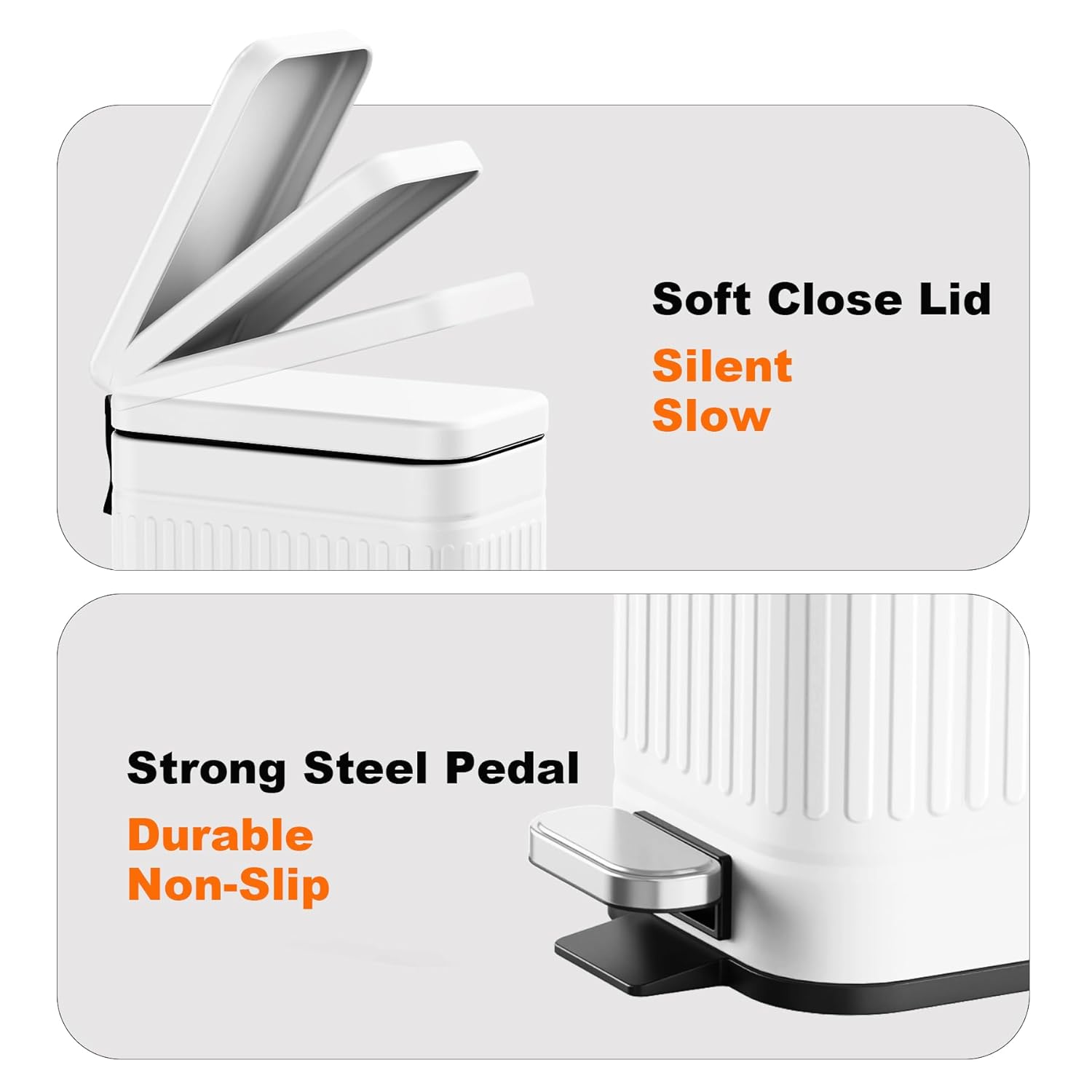 • Soft Close & Odor Containment: Experience smooth, quiet operation with our soft-close lid. Open it with a simple push to 90° for extended use, and when the lid is closed, this bathroom trashcan also blocks odors to keep your environment fresh