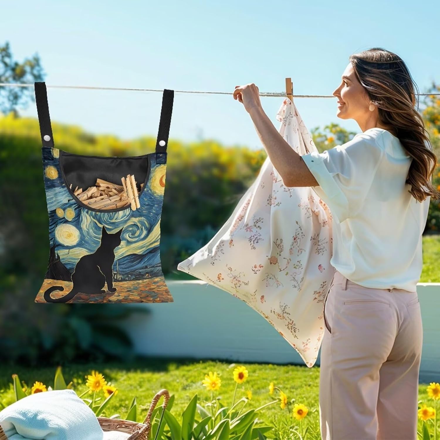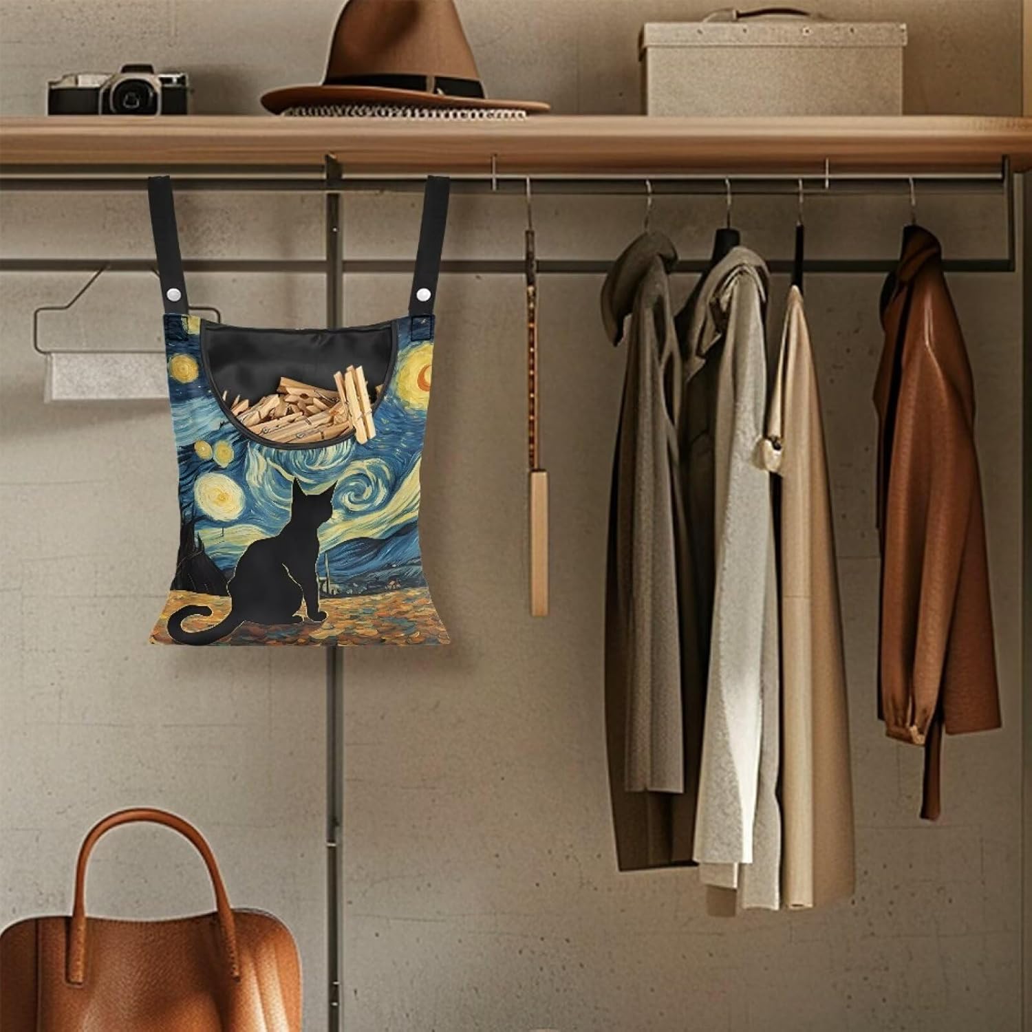 Button Fastening Clothespin Holder 14.5"x12" - Large Access Opening with Durable Binding - Professional Grade Hanging Organizer for Daily Laundry Needs Starry Night Kitten Print