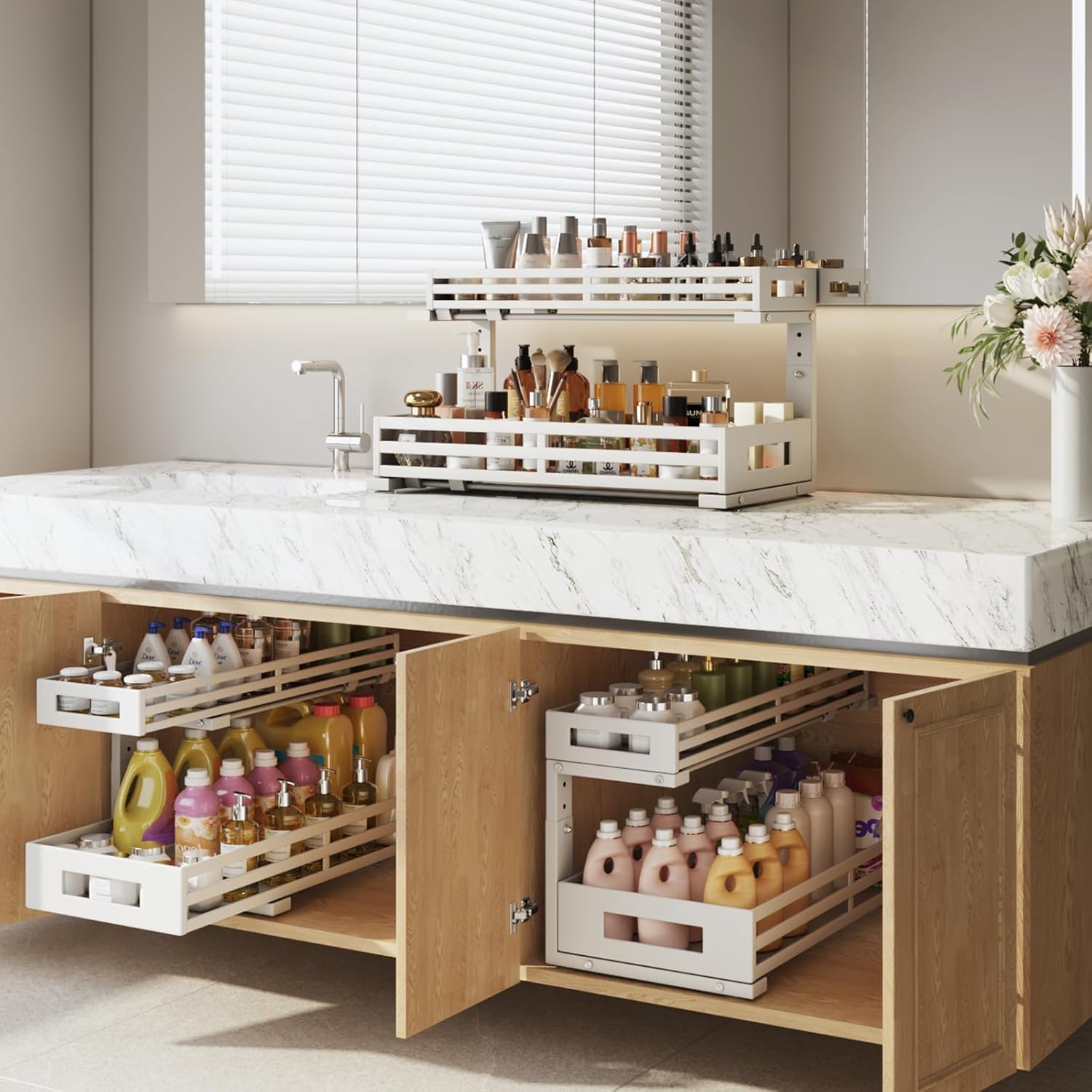 • 【Sturdy metal sheet frame& Rust-Proof】The under sink organizer is built from solid metal sheets with a strong frame and superior rust-resistant design, making it durable and ideal for long-term use in humid areas like kitchens,bathrooms and Laundry Room.