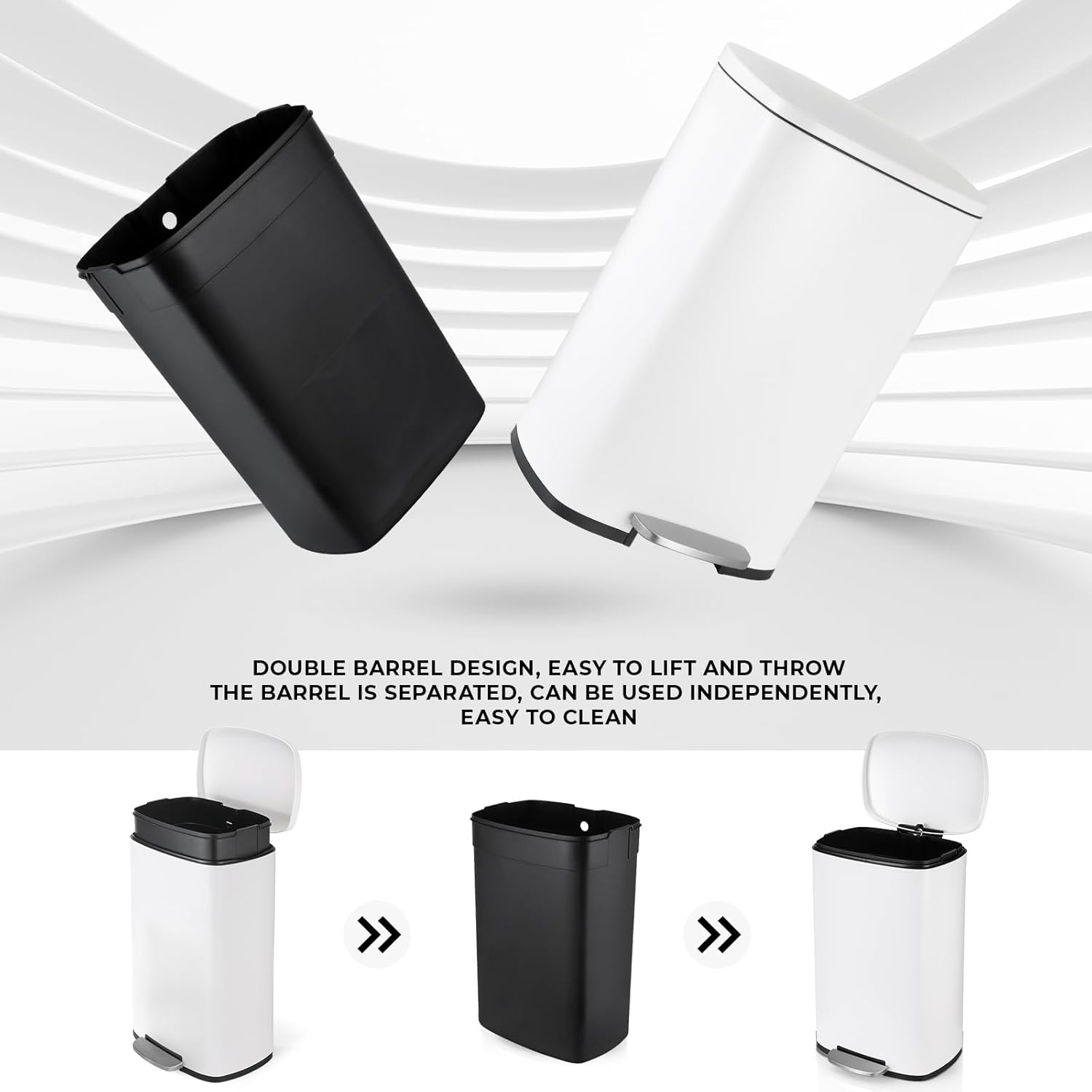• Quiet Closing&Lid-lock: Heavy-duty garbage can is built with integrated step pedal mechanism and the force damper, which soft open and close lid while preventing slamming and banging. Lid-lock can help keep trash can open without stepping if you are inconvenient to keep stepping on pedal.