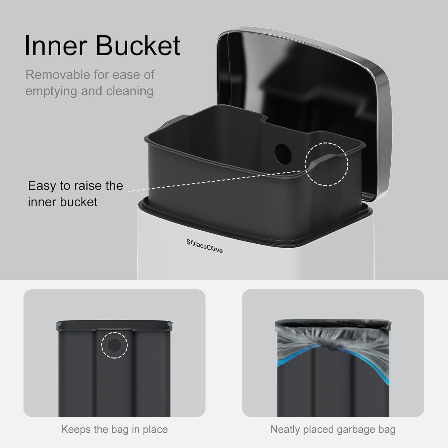 • 【Removable Inner Bucket】The included sturdy plastic inner bucket makes trash removal a breeze while preventing leaks or tears in garbage bags. Simply lift it out for quick and mess-free cleanup.